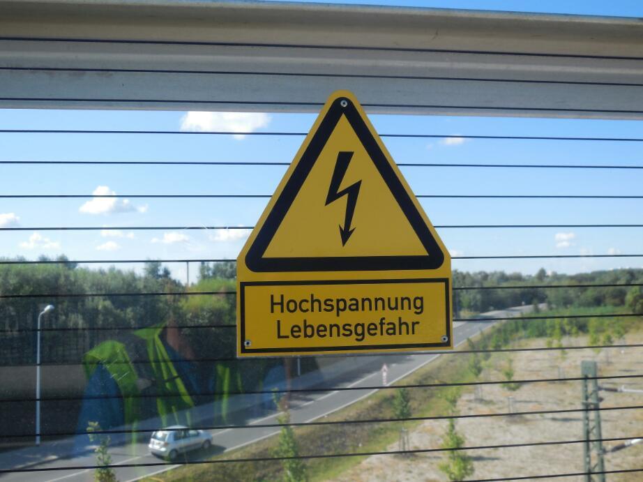 This gefahr is puzzling. It was on a barrier that looked electrified, over a train track with electric overhead power. Is the plan to electrocute me if I try to jump? Or are they saying if I do jump I will die not from impact but from the electric lines below?