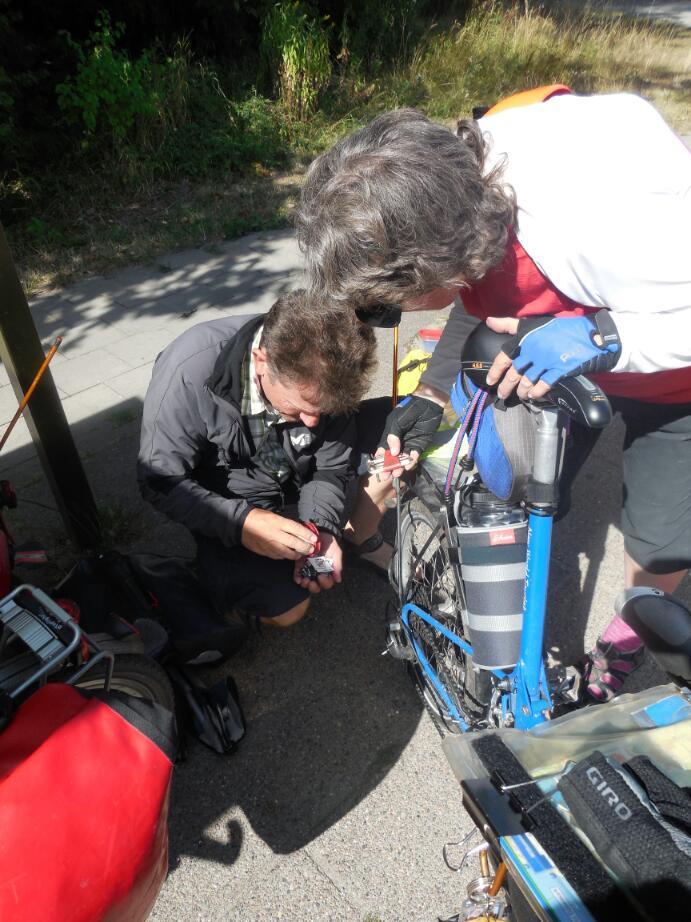 Dodie and thomas were ahead, dicussing the complete political party arrangement of Canada and Germany. I waitd to butt in, and said "We should stop, my derailleur is broken". As it happens, a bolt had fallen out of the rear rack, leaving the strut to drag on the cassette. Fortunately we carried the right replacement bolt, here being installed by Thomas.