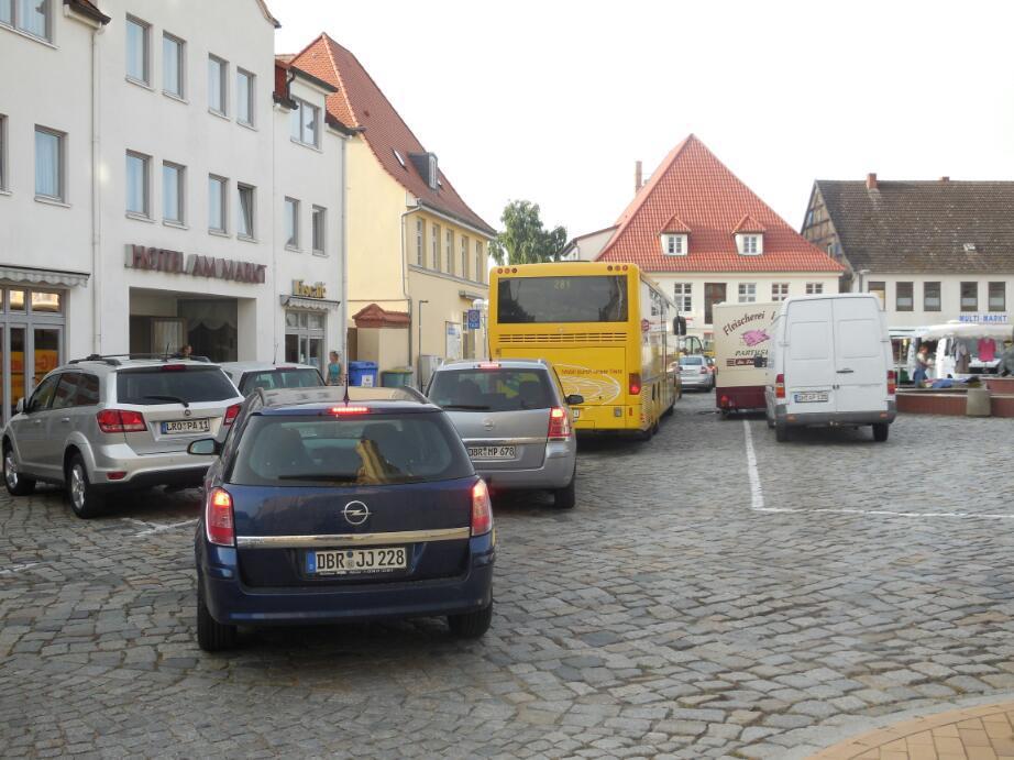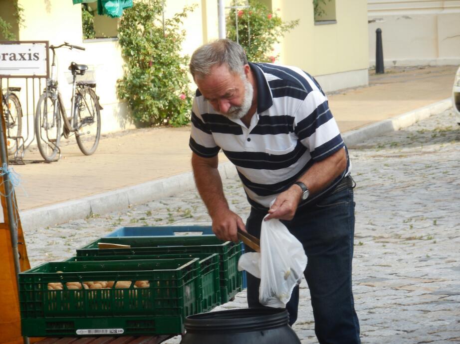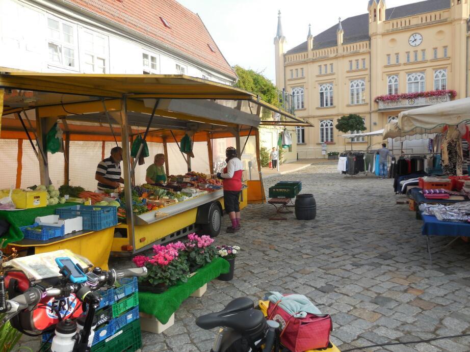 Around seven we left the canoe club and cruised into Butzow. The town was already awake, and was doing all the classical things an active small town should do. Neighbours were greeting each other in the street, kids were getting ready to go to school. It was garbage day, and streets were blocked with garbage trucks. There was even a small traffic jam in the market square, and on another street that had construction going on. A farmer was adding to the mix with his tractor and giant trailer.