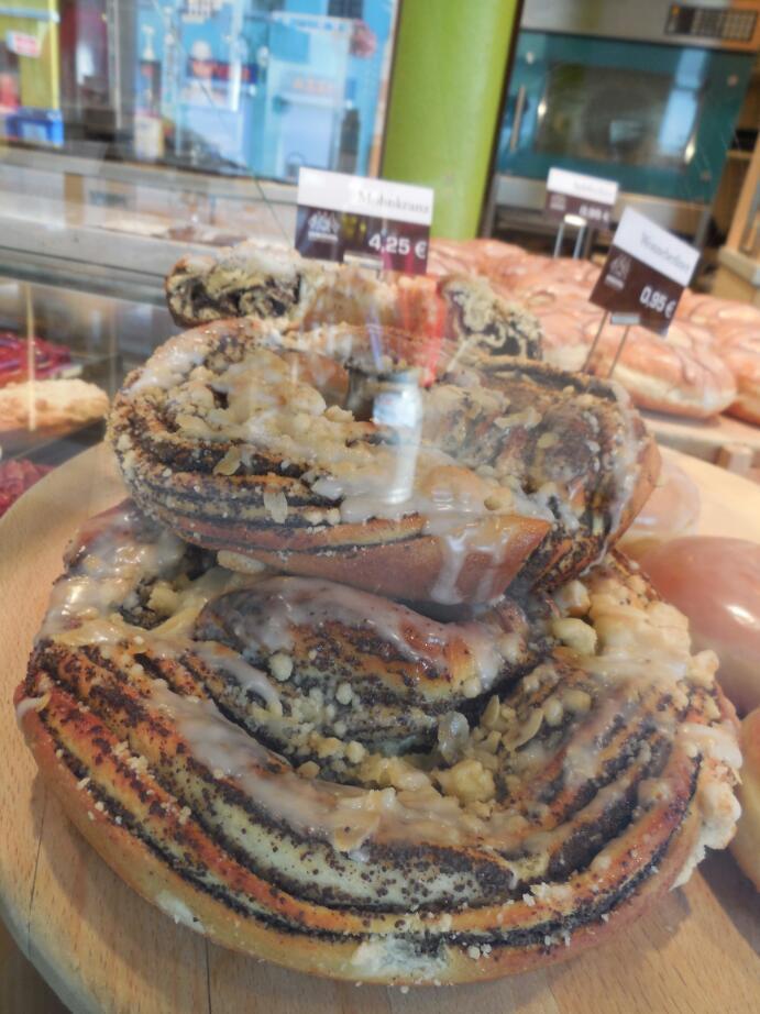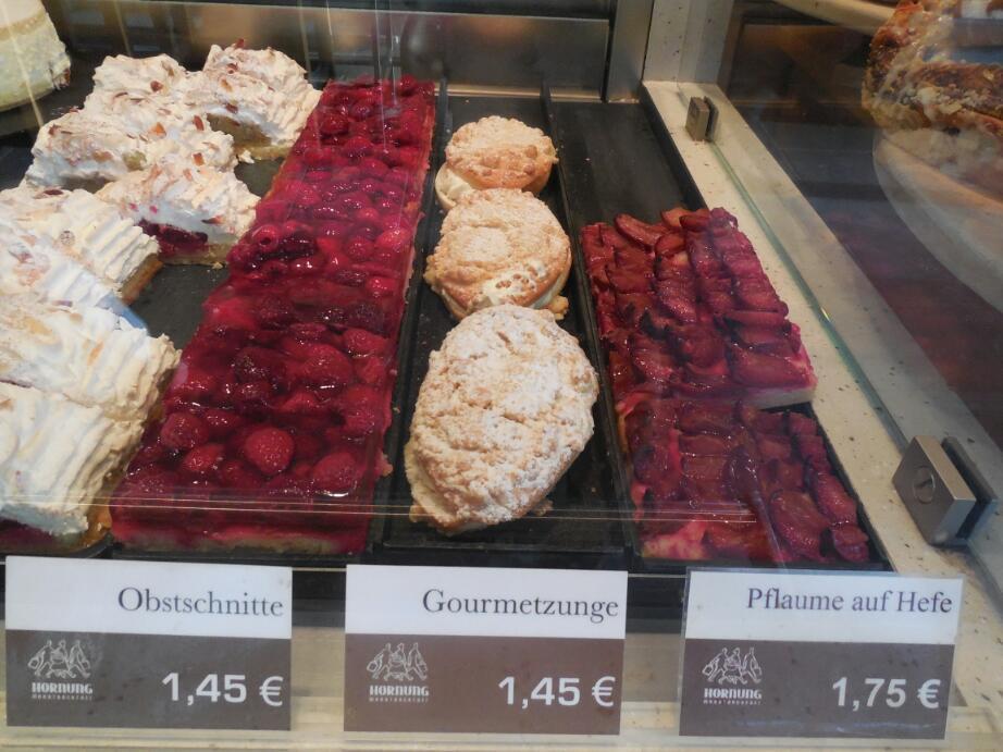 In the market square we bought some mohn kuchen from the "market square" bakery. Across the street was the "city bakery", and down the way, yet another one. In the square some stalls were already up - fruits, wurst, etc. We bought cherries!