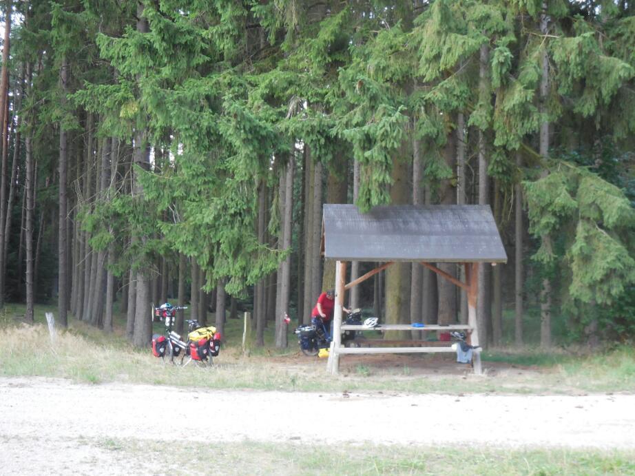 We actually stopped about 3 km short, while still in the forest, because we came to a fairly secluded covered table. Grampies love covered tables. So we put the tent behind it, heated ourr soup, and dined seated like real nobility (or at least, not squatting in the grass).