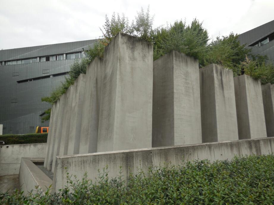 Now finally, to the south a bit, we passed again the Judisches museum. Again, the police, and again, the radically scary metallic annex. Beside it we now noticed the forest of vertical concrete columns - a memorial we had read about. Access is only from inside the scary annex, but we had a peek from outside. Dodie thought the grass growing atop the columns was a "hopeful" symbol. We asked a police officer about how to get in for a look. Did you ever feel guilty at a border crossing, even though not being a smuggler? Talking to the man, I wondered if he wondered what explosives might be in all those bags on our bikes.