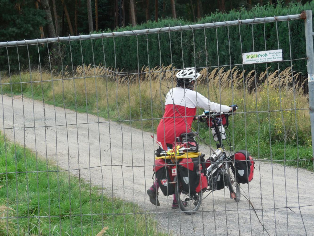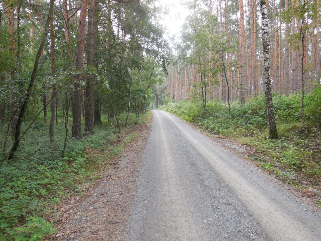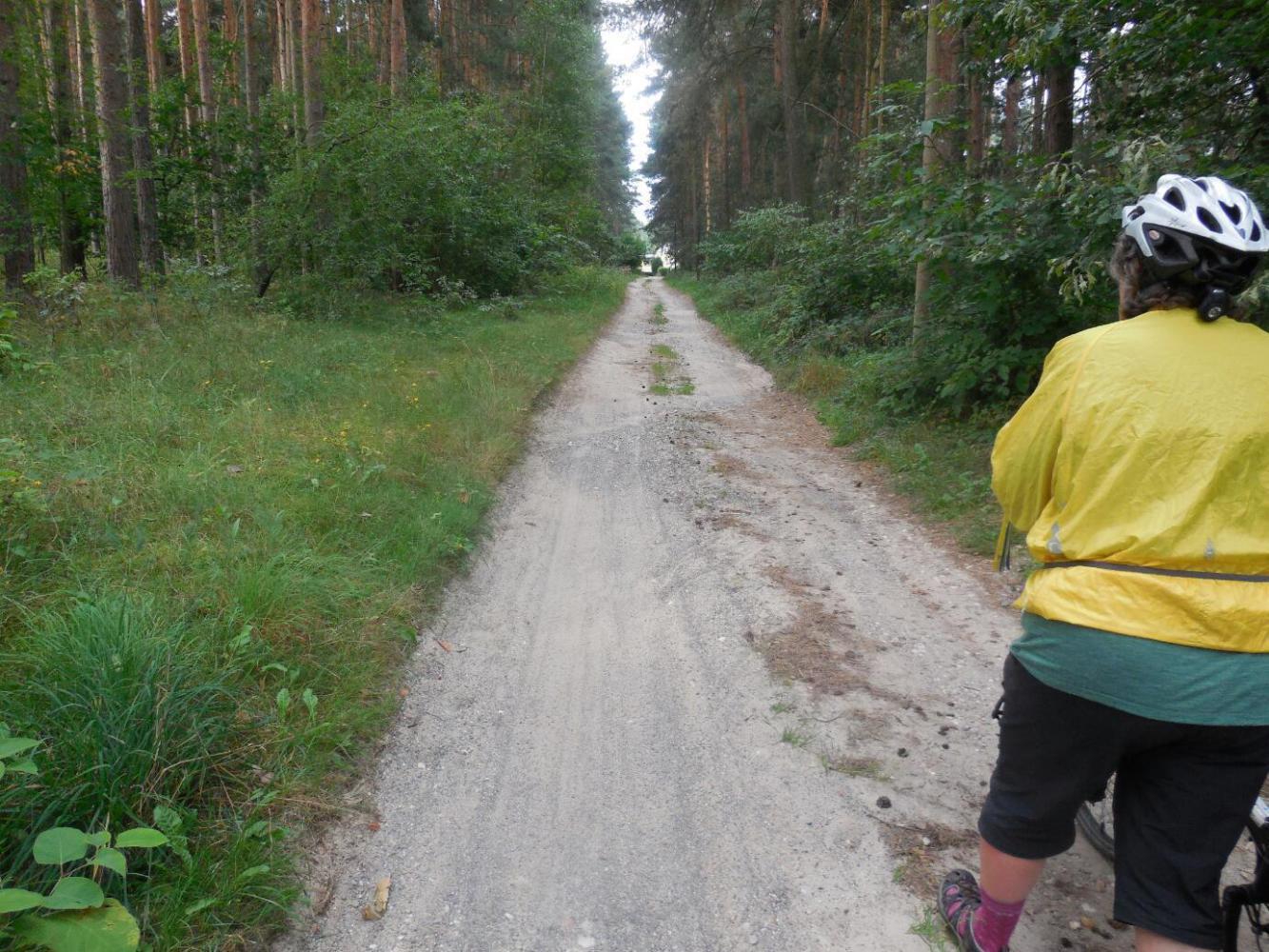 The first thing that hit us, and the main feature of the day was the routing of the Berlin-Leipzig radweg through a series of forests. Actually, these are labelled on the maps as "Heide", which we thing we have learned refers to heather, and which would make these areas "moors" or "heaths". All we saw, though, was pine forest. More to the point, all was saw was dirt track through pine forest.