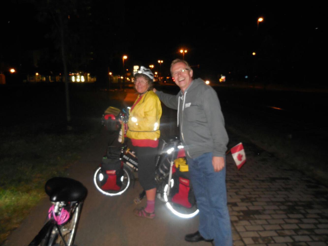 Sebastian and Nadine have been planning a cycle trip from Anchorage to South America, so we found them well versed on the conditions back near our home. Most fun, though, was to be able to talk "tech", such as how to keep electronics charged while on the road. Sebastian commented on how I apparently had a Power Monkey - correct! And I sagely asked him if he had ever heard of the German product from Bosch and Müller - the eWerk. Aha, on his bike already was an eWerk connnected to a Power Monkey Explorer! Don't we just love this stuff!