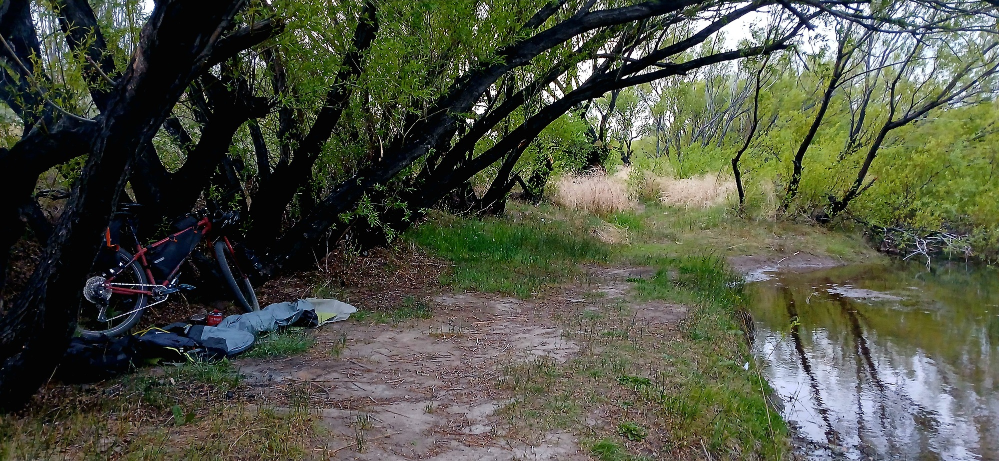 I crossover the bridge and descend the track to the riverbank where I quickly set up camp in a grove of willowy riverside trees, have a quick supper of soup and crackers before settling into the bivouac to sleep.