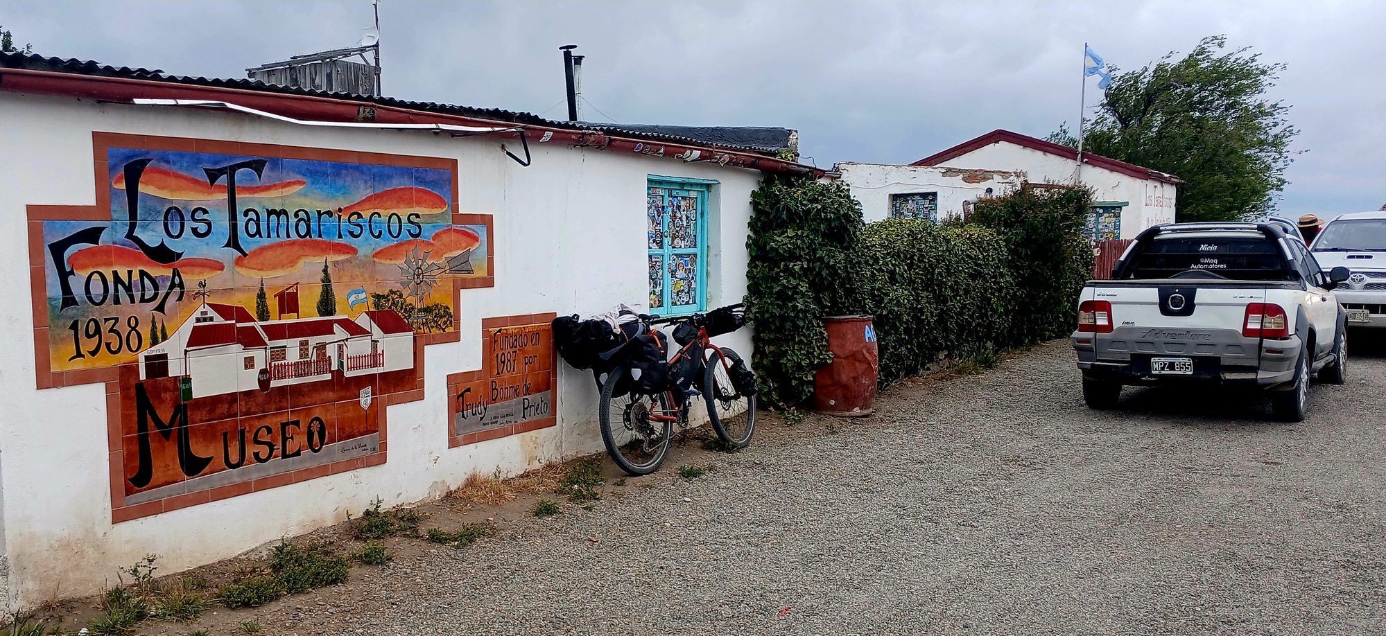 The Argentinian flag outside the hotel window hung limp on its flag-pole, meaning the wind has eased. It was time to pack my backpack and secure it on the back of the Kona, then look for breakfast. The breakfast room was empty as the woman put dubious coffee and a plate of not too fresh media lunas on my table, then two other guests, a couple in their late 40s come in with a mate thermos in hand and ask the woman to fill it with warm water.