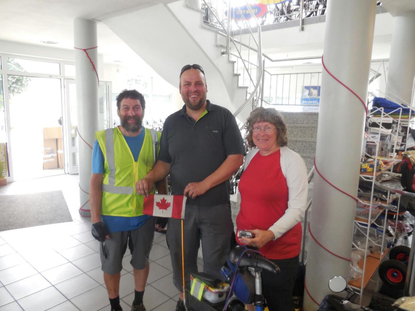 Because we were doing so well, I showed Klaus the stripped frame dropout for the rear pannier rack, where Jurgen had popped in a pop rivet as a last resort. Klaus had another idea - put a nut behind the stripped dropout and make room for it by putting a spacer on the axle, to move the frame and dropout away from the smallest ring on the cassette. Probably this description is too fuzzy for anyone to understand, but the summary is that it was a plan that could work, but would require some fooling around. I said - let's see if the pop rivet holds up.