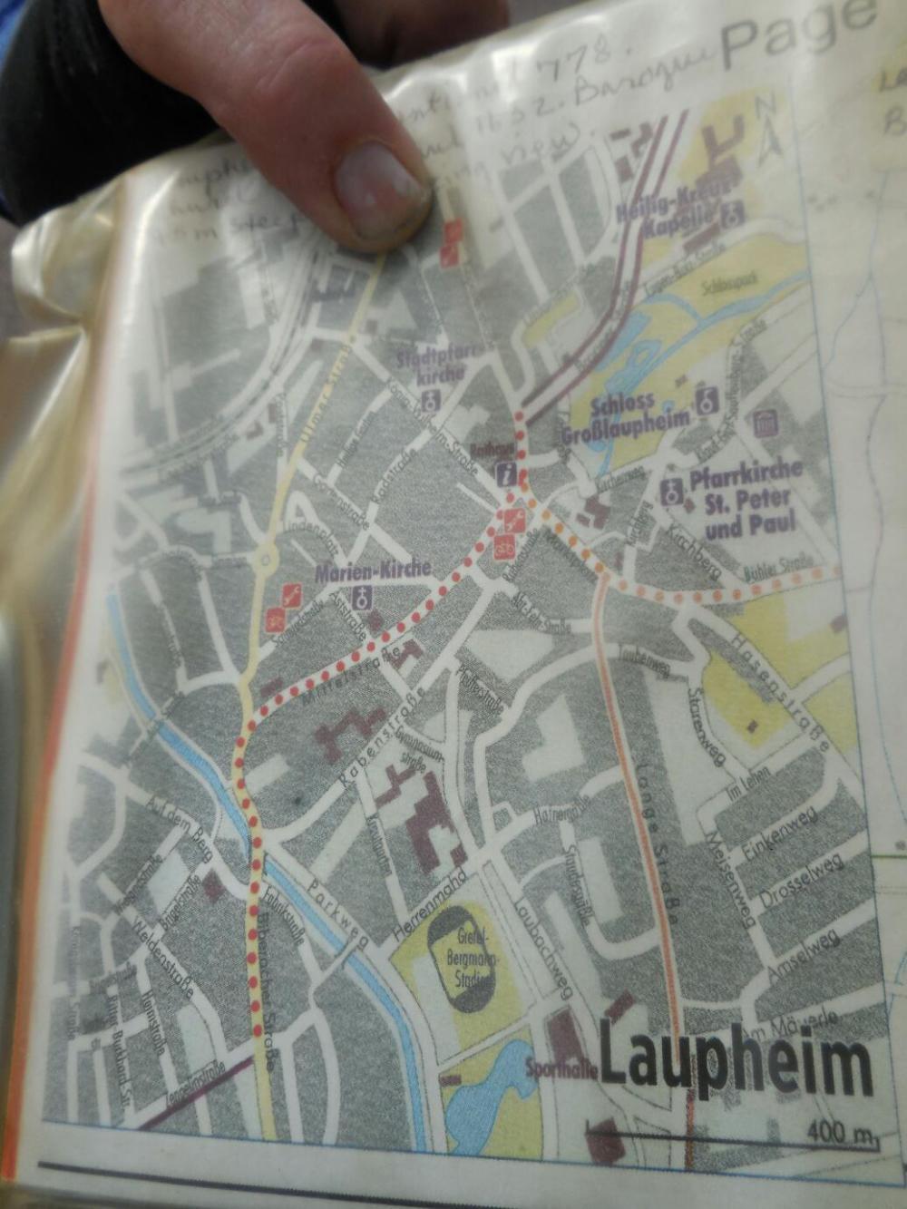 We fetched up in Laupheim, which has three bike shops, and stumbled onto one of them. Bike shops, like anything else, offer variable service quality. But here I was impressed that the man came out of the store to ask how he could help. Klaus, as he turned out to be, spoke English well enough to clearly explain the features of the computers he had in stock. Then he allowed me to pretty much botch installing the one we chose, and came behind to properly affix the mount, the sensor, and the cable routing. He also set up the Sigma computer using a neat handheld device. The price ws great, too.