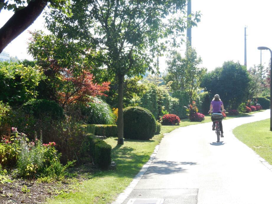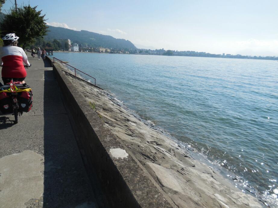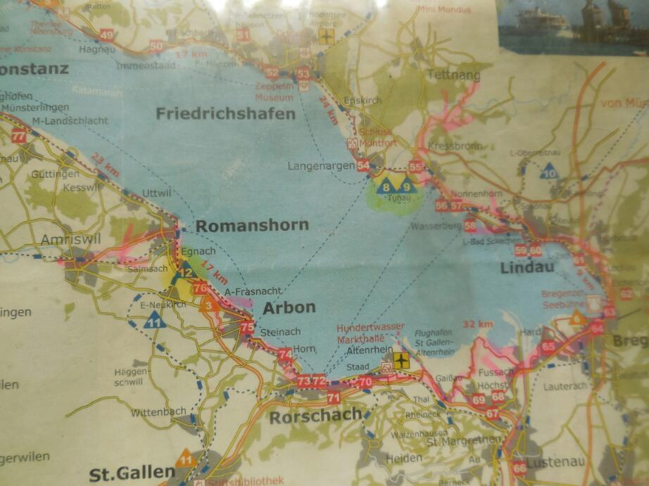 Soon we were back on the wonderful street, full of quality cheese, fruits, etc. and ready to go. From Wangen there are several routes to the Bodensee, and it can be a bit confusing. We abandoned our original plan and shot for Lindau, a little further east around the lake. Even doing this there were a few bike route choices. We initially followed the "Way of the Frog" as I called it, then the "Blue Wheel" bicycle symbol, and finally we just shot into town on the bike path beside a main road.