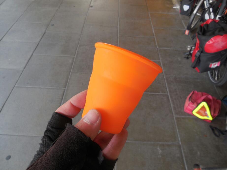 The altstadt of Lindau is on an island, just a little offshore and linked by two short bridges. Just before hopping over we found a sporting goods store, and it yielded what I had expected could only be found in REI - a small size folding silicon mug. One of the luxuries offered on my bike is hot coffee service. But when you drink straight from the flip open thermos lip, you can burn your own lip. So a mug is best. My regular folding mug lives in the kitchen bag, so clearly I needed one in the handlebar bag.