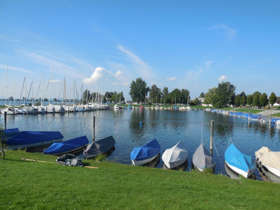 The Rhine runs into the lake here, coming down from its source about 150 km south in the Alps. It formed a delta, and today there are two water courses, the engineered (new) Rhine, and the original or Altes Rhine. The old Rhine forms the border between Austria and Switzerland. We crossed it on a small bridge, and then cycled beside it to where it enters the Bodensee. This is the Rhein Spitz, and it's where, at a yacht club campground, we have pitched our tent.