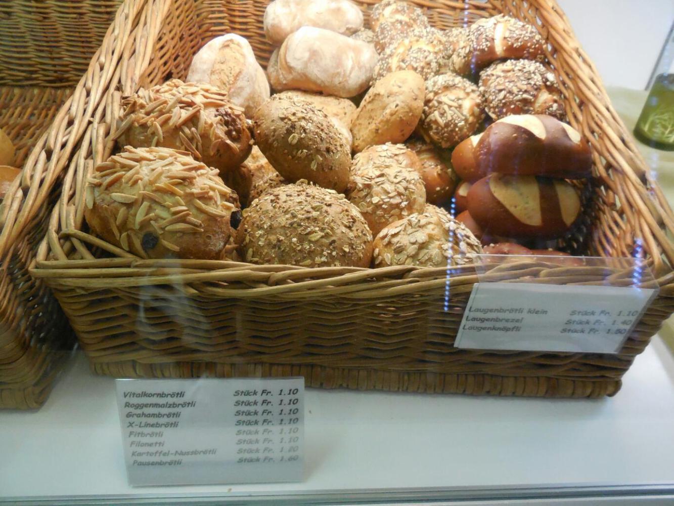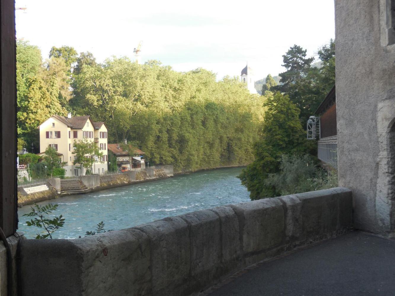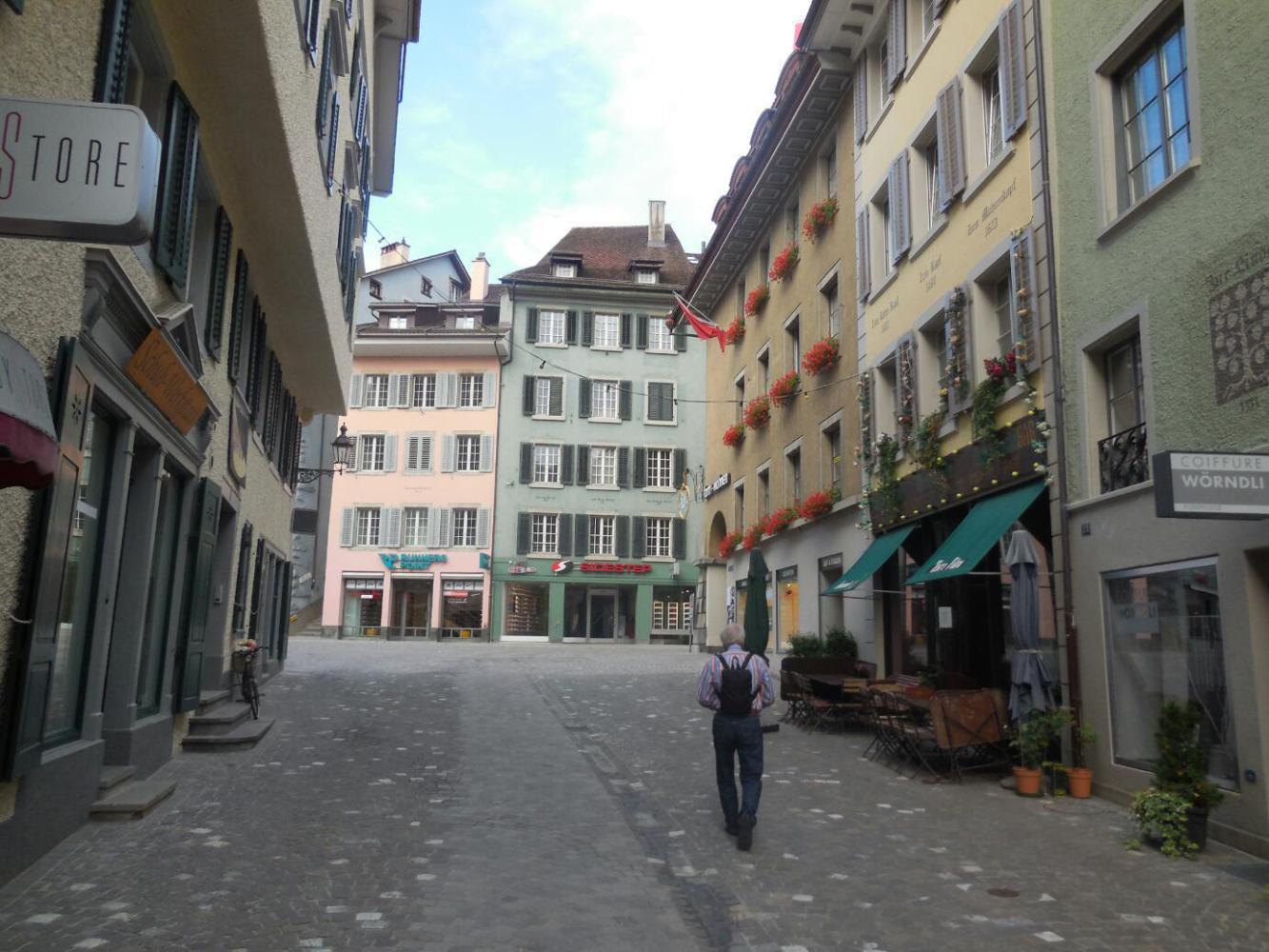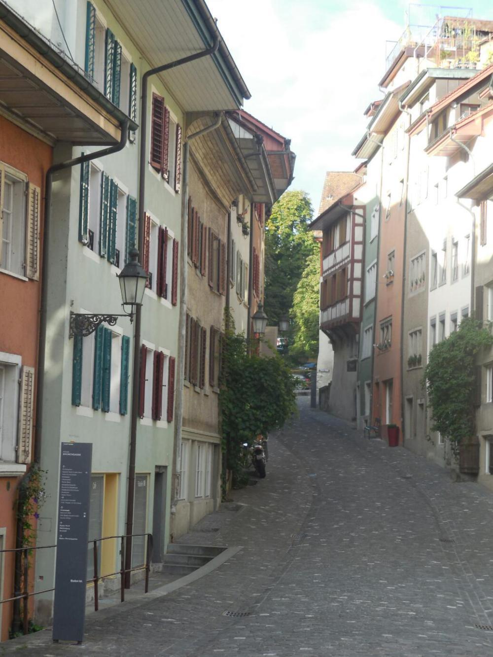 Actually, today did have some good stuff in it. Baden, for one. Here you cross a bridge by steep banks, and ascend into an altstadt. It looks different from german ones, plainerbut with buildings that are still satisfyingly crooked, and with dates in the 1400s and 1500s on them. We also found a bakery, our only one of the day. It too was plain, but the quality was not bad. The prices, though were double to triple German ones.
