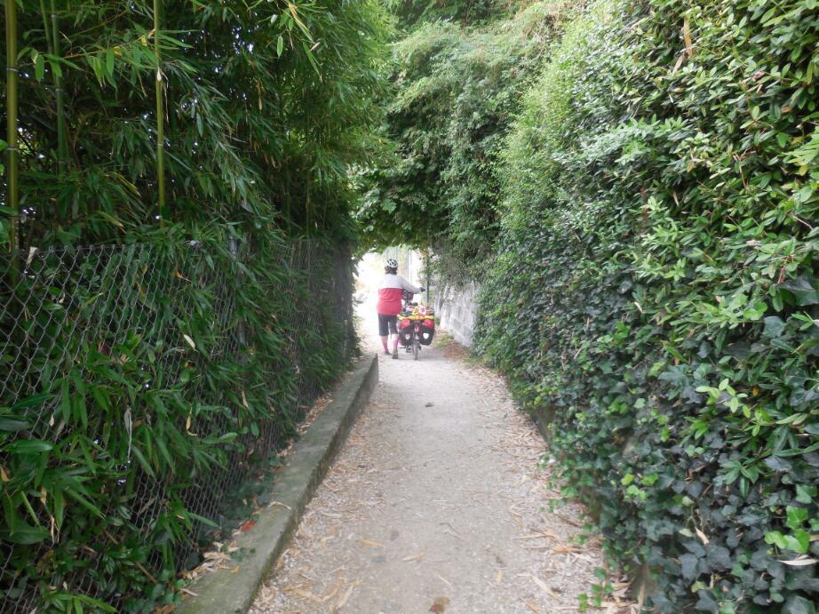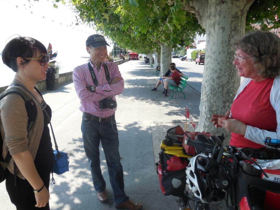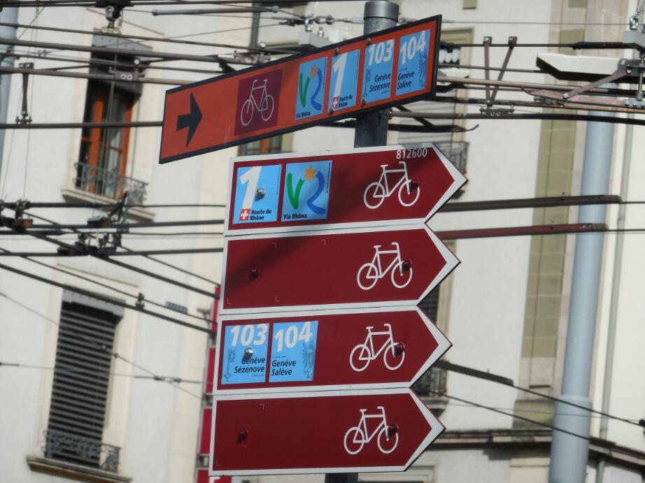 The first order of business, of course, was to find the path. We did find Route 1, but when it headed off (up) into the vines, we took some advice and set off along the lakeshore. As with yesterday, this soon came to grief, with slow going on narrow gravel. We climbed out, and eventually found the right compromise - car route 1, to Geneva. For most of the way this had a bike lane that worked out well.