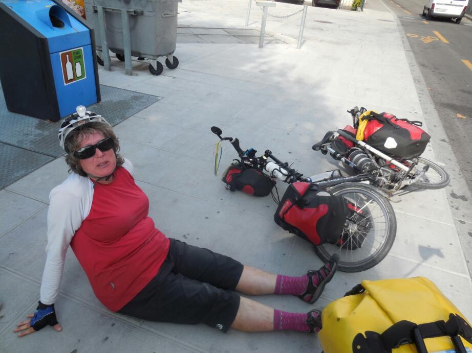 Now, ee had only to go to the camping. The GPS lead us this way and that, but Dodiecwas now moving soo slowly, that the camping was not getting much closer. The GPS also directed us sreeply up into the vines, and I pushed first my bike and then Dodies. Even so, and even with the GPS promising the camping really close, now, Dodie sat down in the vines, completely out of strength. A cookie only got her a little ways further, so we pitched our tent just beside the vines and quit. Actually, I whipped up the tent and got Dodie inside, where she crashed. Thevtent is home, and it felt good to have her safely in familiar surroundings.