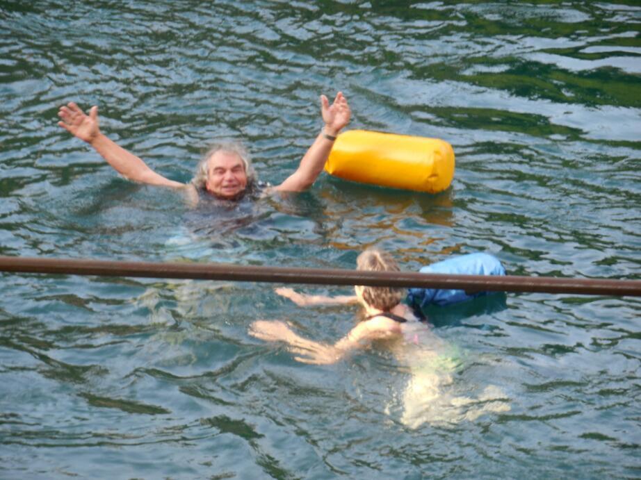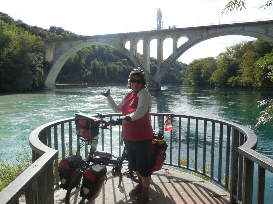 We were pleased to find bike route signs with both our old Route 1 and new Via Rhona sharing the same pole. We followed these, right into a dead end in the middle of the river. Grrr. Still, we got to see people enjoying the Rhone, which is greenish and clean looking, by swimming and sun bathing.