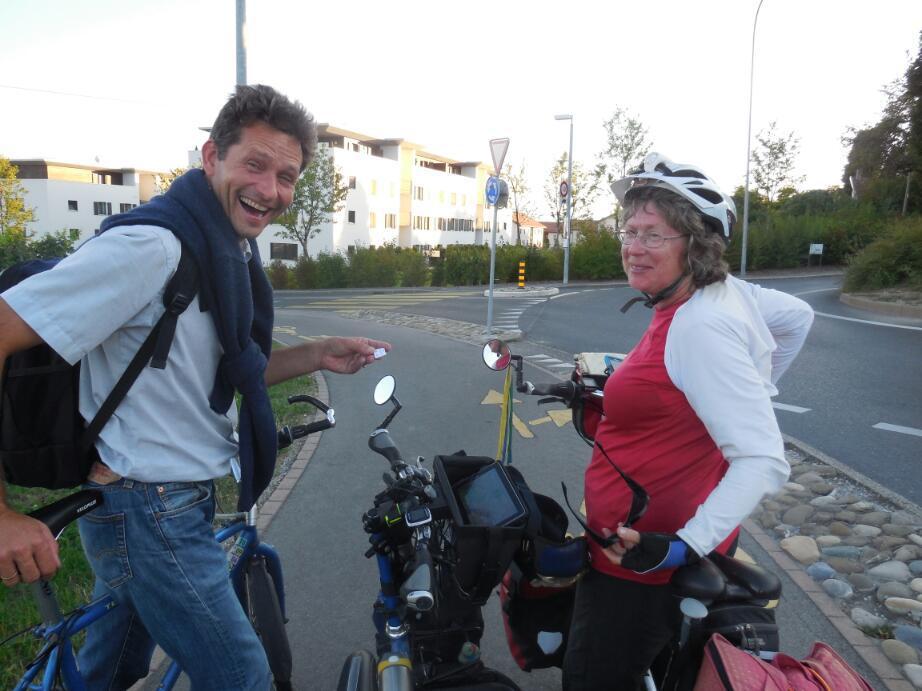 Just before CERN we needed to decide about deviating to find camping. Since it was after 6, it really was a priority. So without seeing CERN we headed off, toward Satigny. This was quite far off, particularly after all the distance to Geneva and then the noise and danger of the city. In Satigny, the GPS was still telling of a convoluted route to find the camping. Here a road angel popped up - Jens - and confirmed that the camping did exist, though it was still some kms away. Though we started in French, it was soon apparent that Jens spoke perfect english. He works at CERN! Jens told us of a tour there tomorrow, and where to enter the complex. Great!