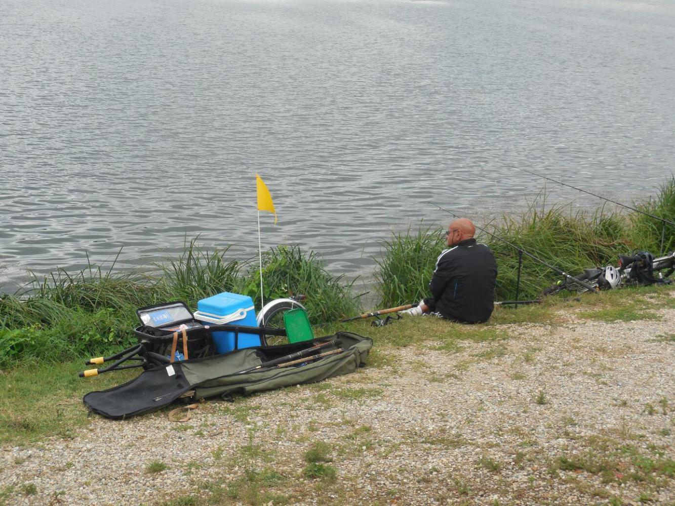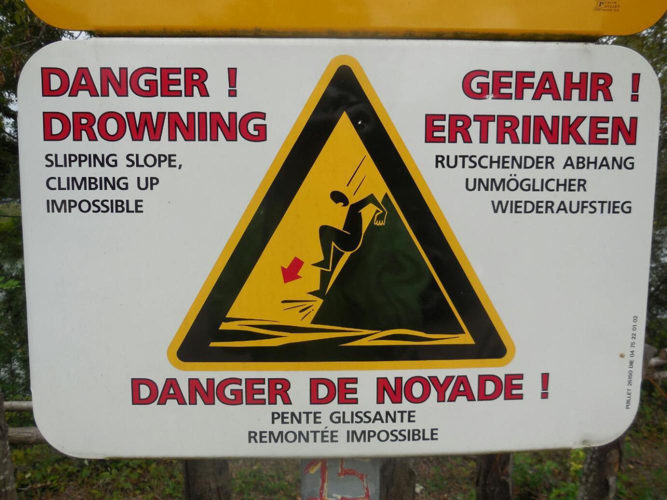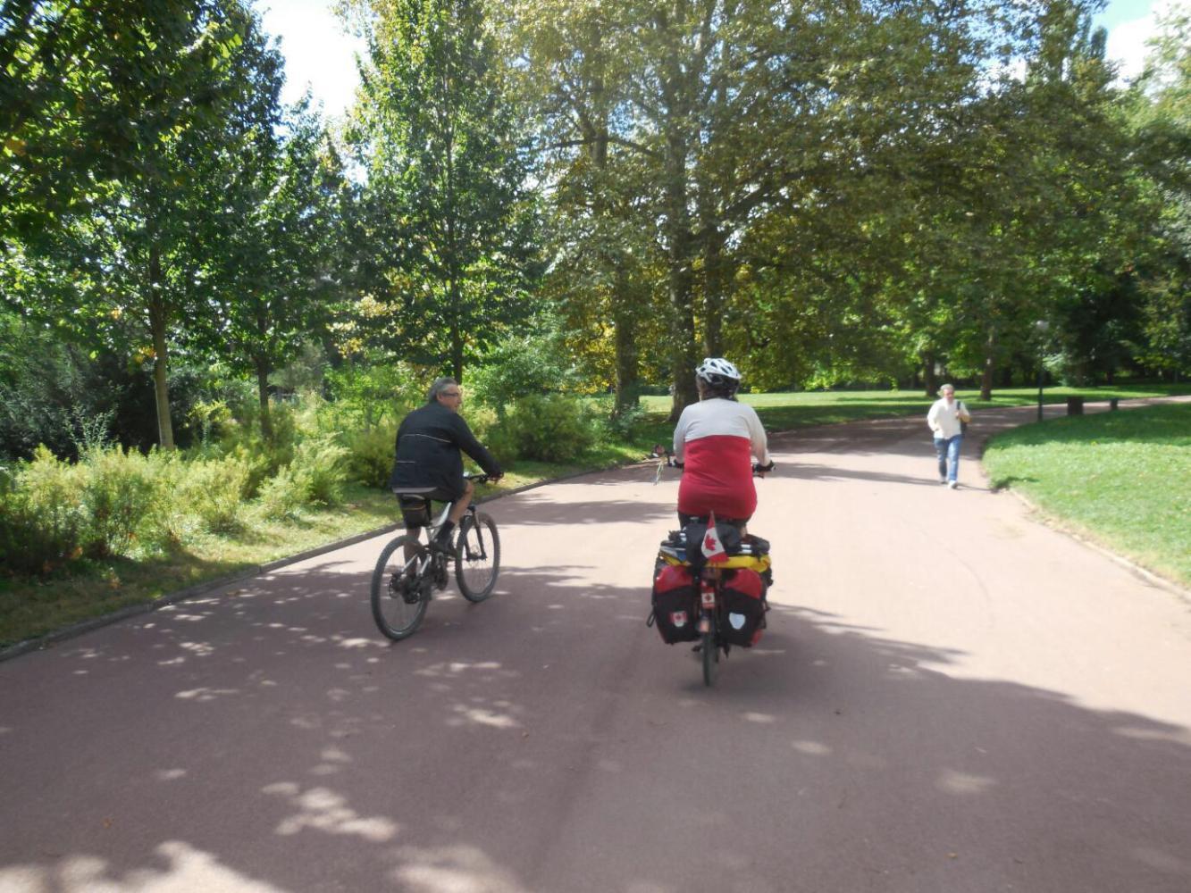 We were able to make our way through the next two towns, just from road signs, and arrived at the river side, perhaps 20 km out of the centre of Lyons. Lyons has some major hydromworks along the river, and the rivere bank is well managed, with a path the whole way and many large explanatory signs. Except that we had to unload and carry our expediton down some steep and long steps at the unmarked entrance to the path, it was a pretty good run. One major exception was where the path was blocked by construction. But here, again, a road angel popped up for us. Eric was out for a spin on his bike and noticed us puzzling over where to go around the construction. In the end he guided us through a major park and put us back on the right path.