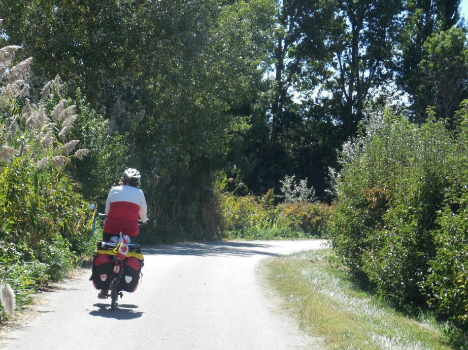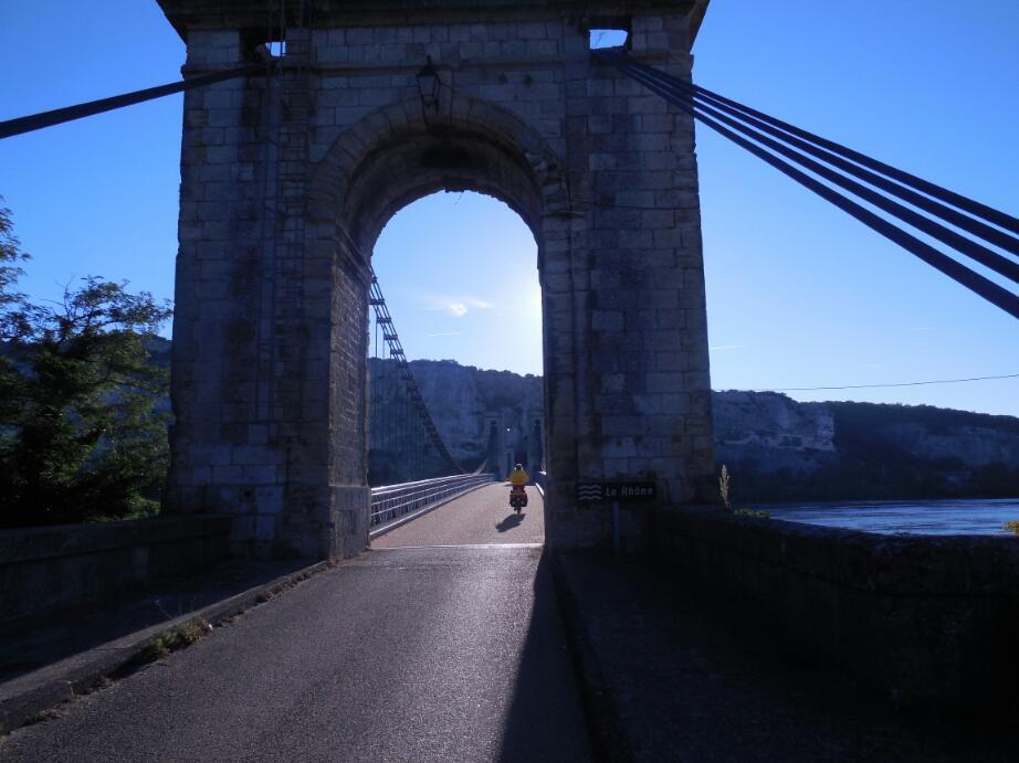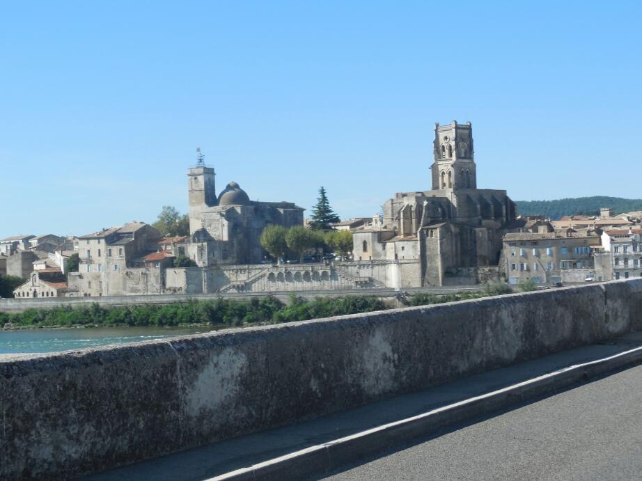 The bike shop in Pierrelatte had only one 20 inch tire, and it was a low pressure knobbly "toy" one. We gave it a miss, gambling heavily that we would not end up walking to the next bike shop town, Pont St Esprit. We had to say goodbye to N7, which has other things on its mind, like probably getting to Marseilles. However we arived in Pont St Esprit quite handily. Almost right off the bridge into town, a girl crossing the street noticed our flags. It was Madelaine, from Mississagua, which of course is in Canada, near Toronto. How strange to hear again the Canadian accent.