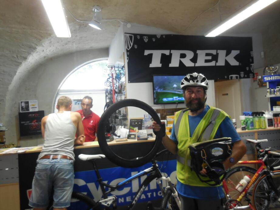 Madelaine is staying and was walking with some local people, and they directed us to the bike shop. One the way, they casually remarked, you will see the Saturday market. The bike shop was nearby, where they had said, and they too had one tire, but this one has a chance of being OK. When I pulled off the old tire, I found the rubber peeled back from the sidewall fabric, and that I could see my finger through that fabric! C'mon Schwalbe, let's get serious here!