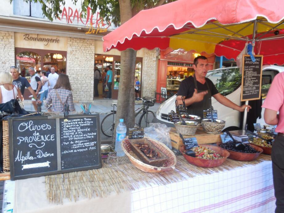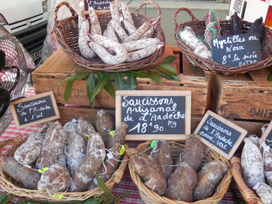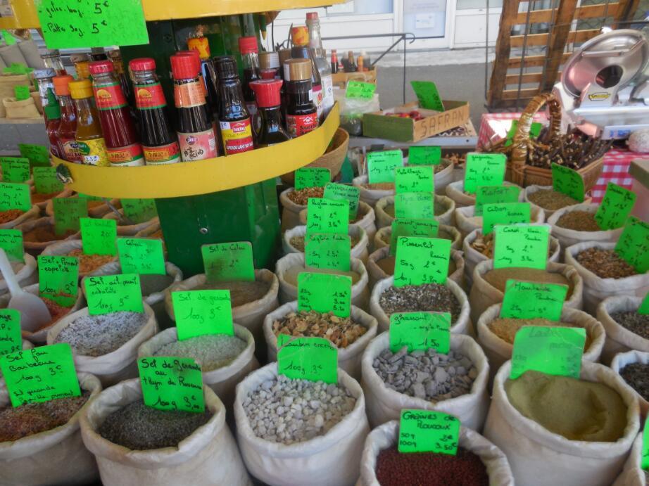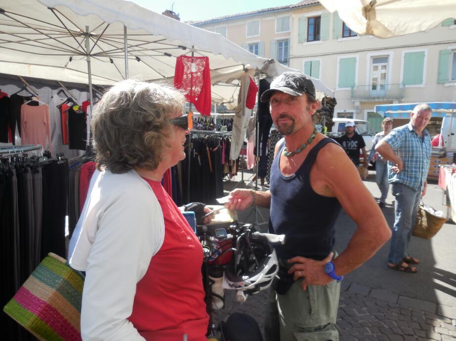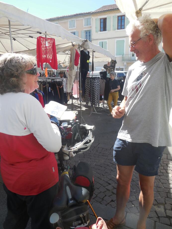 We crossed back on the bridge at Viviers, looking for a quieter way south than on the D86. Down about 10 km to Donziere, and this being Saturday we ran into our first market. This being the left side of the Rhone, this would also likely qualify as our first Provencal market. The town is small and the market was just getting into gear, but it was still a thrill.