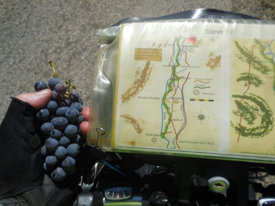 The town of Chateauneuf du Pape is pretty, like most towns in this area. What distinguishes it are the large number of Domains, and Caves. They are everywhere. Since wine tasting is not our thing, we just cycled through town marvelling at it all, and carried on to the camping by the river.