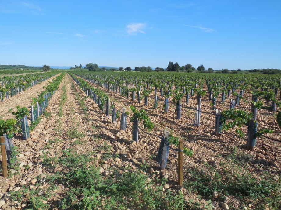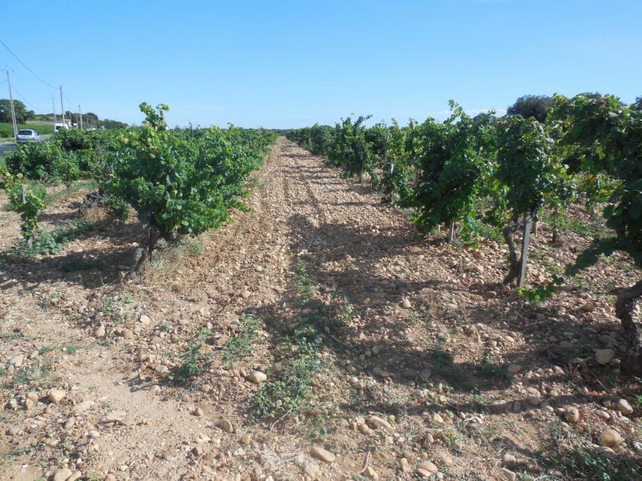Eventually we came to vines that were on the flat, not up hills, and that were individually staked, not on wires, and that generally looked very bushy. Finally we noticed that these vines were planted in incredibly rocky soil. We had arrived: Chateauneuf du Pape, with (we soon learned) its famous rocky soil. p.s. to be perfectly fair, Dodie is the one who noticed the rocks, at the distance, I thought it was mulch. Duh!