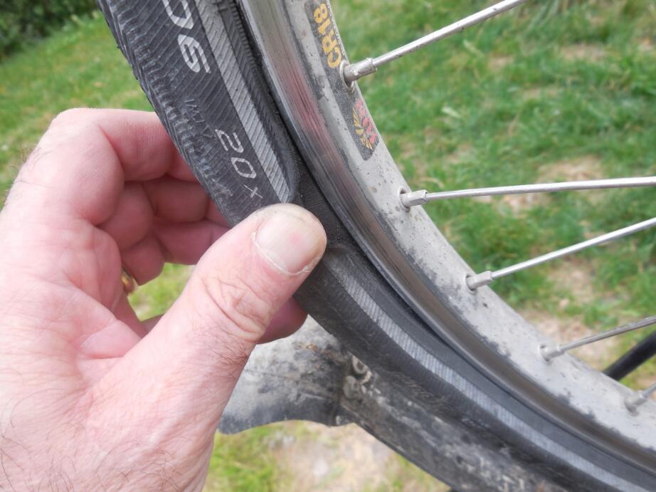 My rear tire, which has been wobbling for a while, got a lot worse yesterday. A close look this morning revealed that good old Schwalbe Greenguard was bulging and delaminating, a bit like what the front did in Germany. The bulge had also moved the tire out enough to rub on the brake pad retaining pin, the bit that holds the rubber in on our replaceable pad Jagwire shoes.