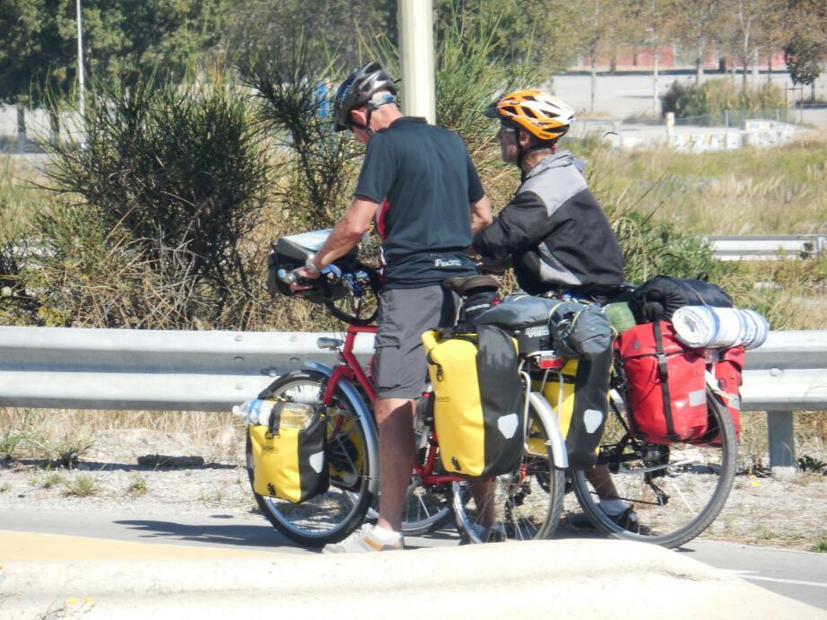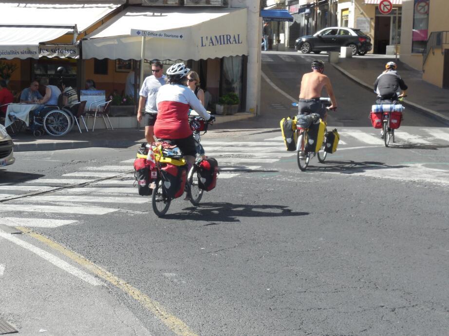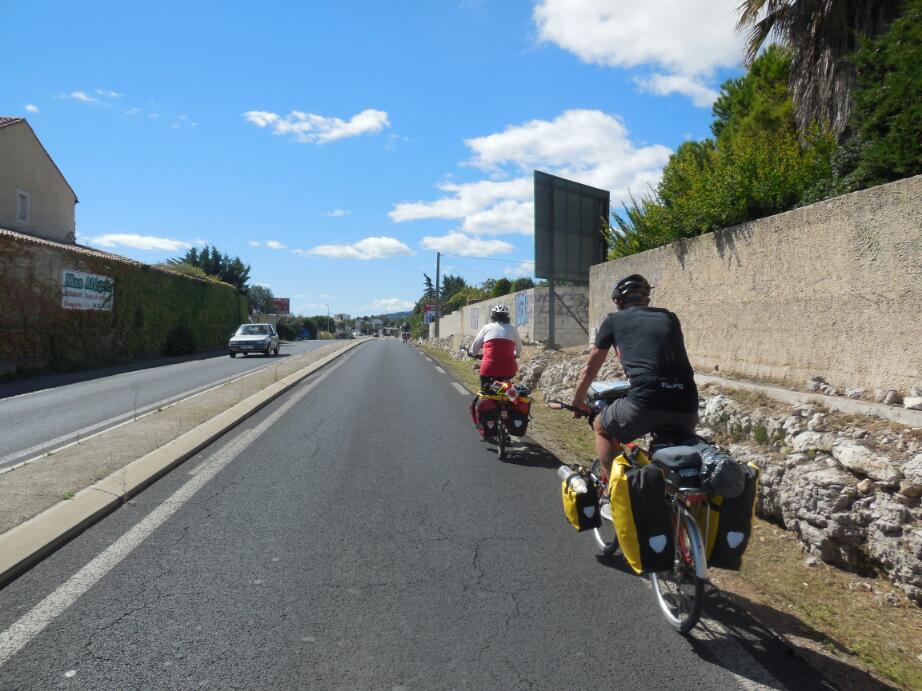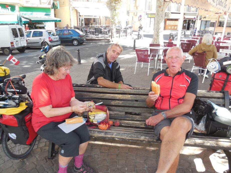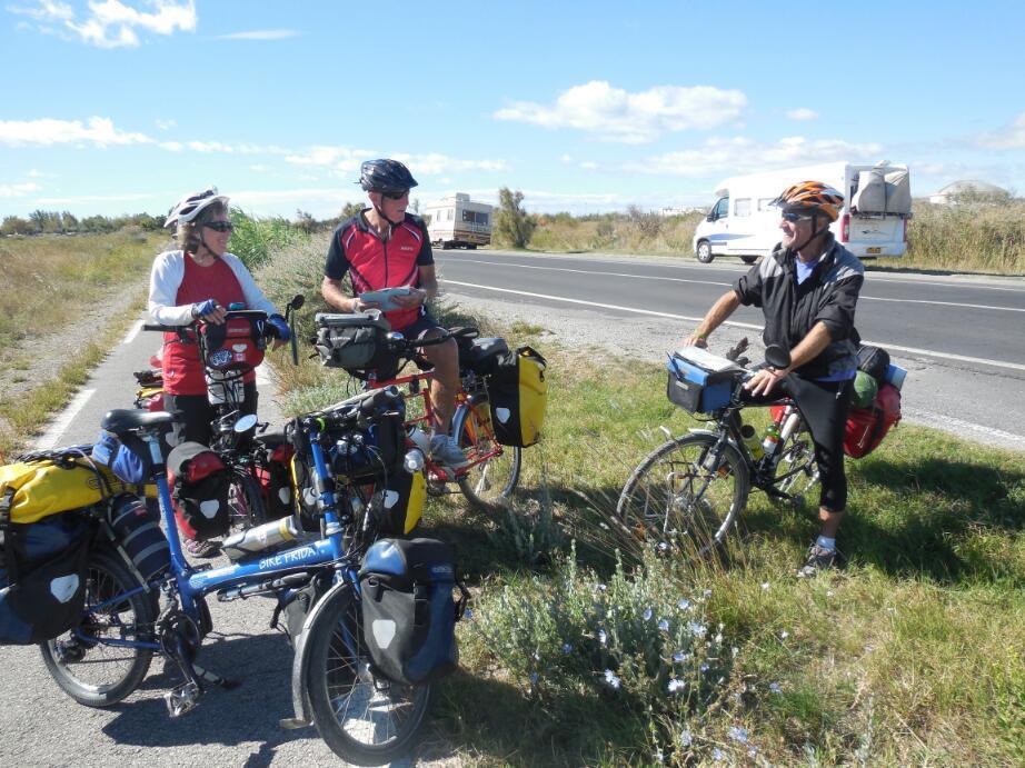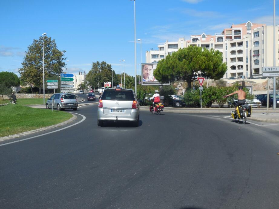 Pete and Manfred were heading generally our way, and had just recently met each other, as well. We convinced them that a retreat to Frantignan, and so was formed, at least for a while, the four musketeers. Four cyclists are much more formidable in a roundabout, normally a very risky place. Also Dodie and Manfred are good route finders, so our joint routing power was at least doubled.