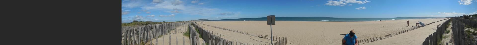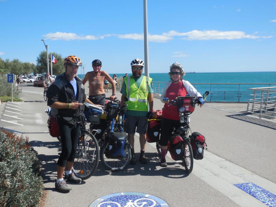As we cycled on toward Agde, we all pausd afew times to admire the wide sandy beach, and the lovely "Mediterranean" blue of the sea. The wind continued, either as a strong cross wind or as head wind, so our speeds were not great. Pete and Manfred were very patient, but as the Grampie speed dropped, first Manfred and then Pete pressed on at their own paces. We were glad to have met them, and of course will try to stay in touch.