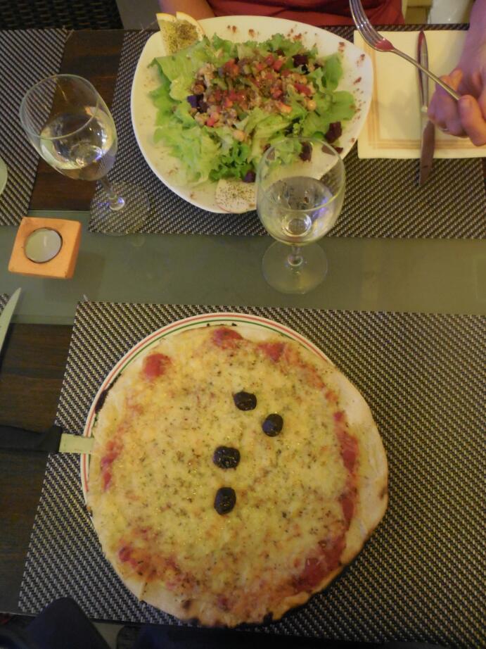 Aside from water, the restaurant had some meal choices for 12.90. I chose pizza as an appetizer, steak with fries and salad, and ice cream. Dodie chose salad, lasagna, and creme caramel. The portions were huge and the quality good. My pizza alone would have been plenty, same for Dodie's salad. We left really stuffed.