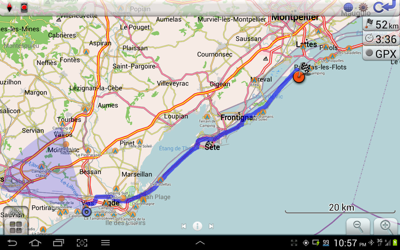 So the GPS got asked to take us to the nearest camping, and Dodie came along, slowly, slowly. When the first camping was closed and the second not really a camping but a vacation rental, Dodie's strength was really gone. Because we were at Vias, which is still on the Mediterranean, I still had three more campings in my pocket. It was luck that the next one was open, reasonable at 20 euros, and had a place for us plus a restaurant.