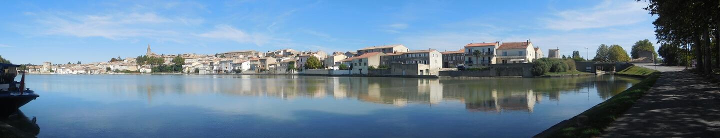 The big thing was that the brutal wind, which we have learned is not the Mistral but rather the Tramontane, had turned off. So we hummed merrily along, the joy having returned to cycling. Montferrand is appropriately a bit of a mountain, but we turned away from it and to the Canal du Midi. This is the point at which Thibaut's map had shown a paved surface, and within a short distance this turned out to be true.