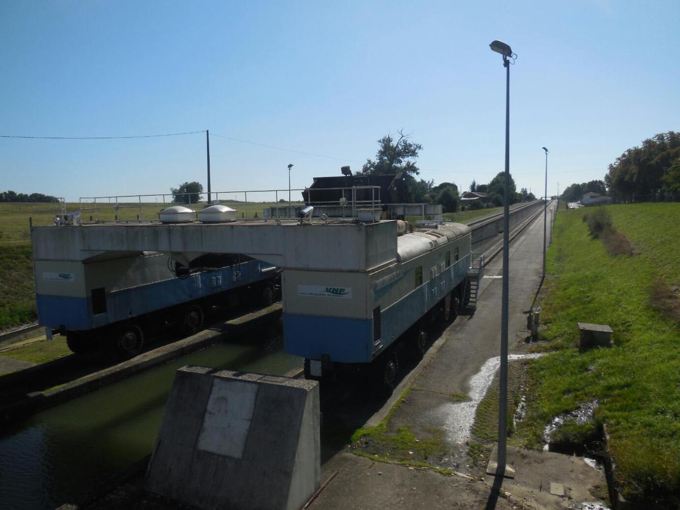 One quite interesting on route thing was at Montech. There, there is a series of five locks. Somebody got the idea of creating a continuous water slope and then dragging boats up it. In fact the system pushes the water uphill and the boat floats along with it. It is based on two modified train engines, on either side of the channel. When we got there the system was out of operation. A sign says they are studying the situation, but no clue about what any issue is all about.