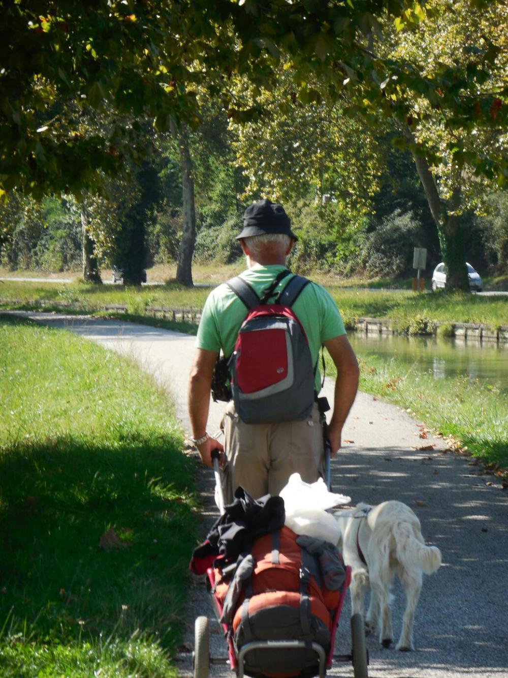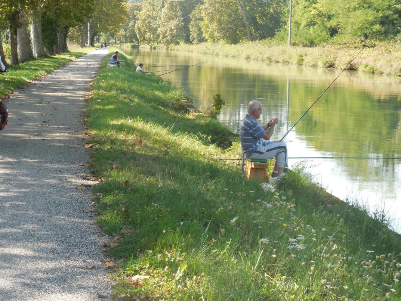 We picked up an unloaded cyclist along the way, but unlike the customary French peŕson out for a spin, this was Hennie, from Friesland. Behind him was his wife and two of their friends. Both couples had arrived by camping car, and were here for a while before heading to the other side of the Pyrenees. Their general idea is to avoid encroaching poor weather back home. Maybe a good plan for us too (i.e. should not return to Netherlands too fast). While Hennie had cycled from Netherlands through Switzerland, cycling could not be a major activity now, because his wife is not into it. However they were doing 15 km out and 15 back on the canal, which is a reasonable day's fun.