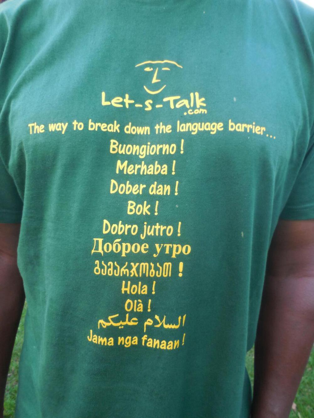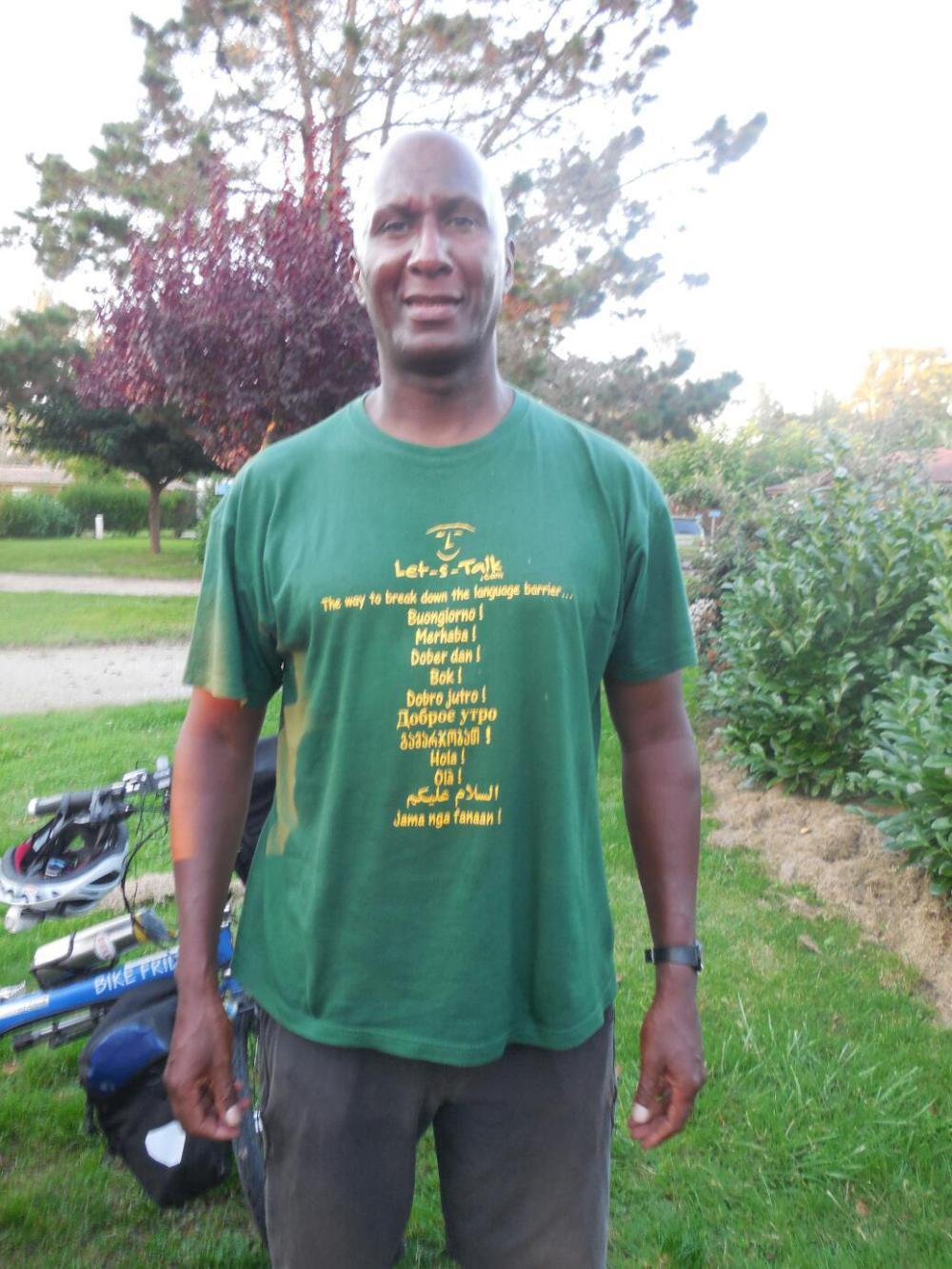 We met one other interesting person today, here at the campsite in Valence-d'Agen. This was Patrick Zulmea, who lives partly in Bordeaux and partly in Paris. Patrick is cycling to Sete and came over to say hello. His tee shirt then caught our eye. It's part of his idea for travellers to wear a shirt that says let's talk, in the language of the visited place. Patrick hopes