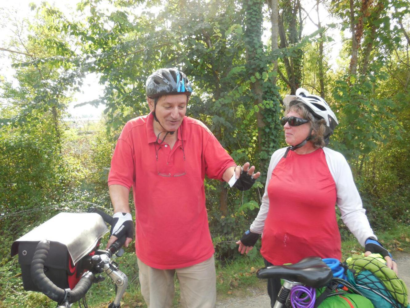 We had another stroke of good luck on the other side of Agen. We came upon a cyclist talking to two youngsters. The cyclist looked up and said "Steve and Dodie", " I know you from the internet: Crazyguy". Philippe, as he turned out to be, lives in Bordeaux and has a son in Toulouse. So he sometimes nips down there along the canal. On this trip, he checked Crazyguy just to see if there was anyone on the trail. He had read carefully, too, because he asked after Dodie's health and discussed which way the wind was blowing now.