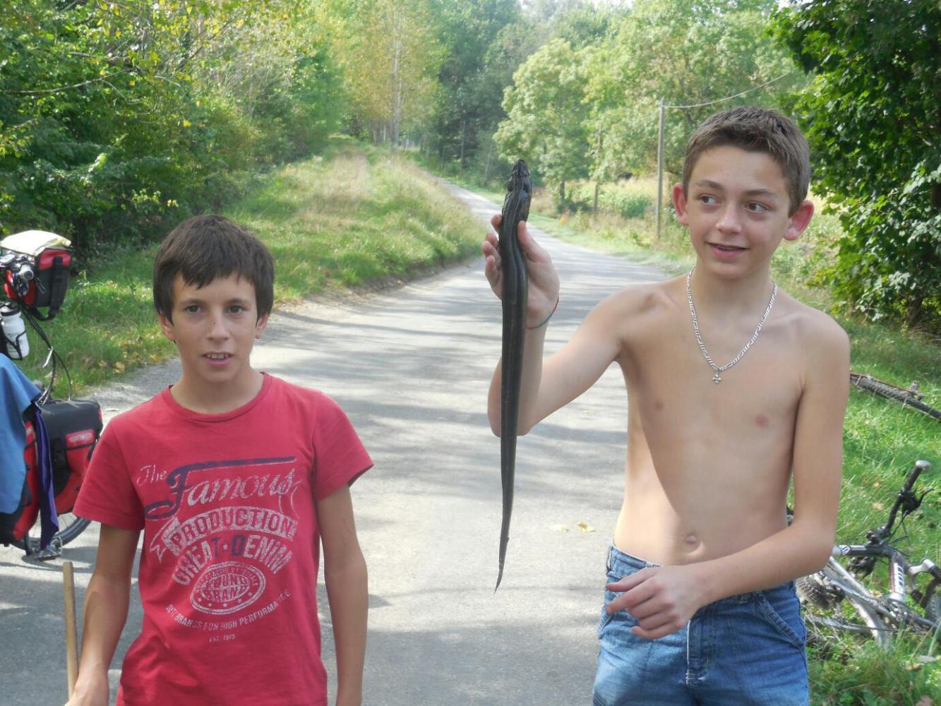 The two youngsters were Dylan and Lucas, and unlike all the other French fisheremen we had seen, they actually caught something. It seemed to us that it might be an eel, leaving us to speculate on what eel recipes they might bring into play when they got home. Anyway, here's to Dylan and Lucas, the two greatest fishers we have found in France!