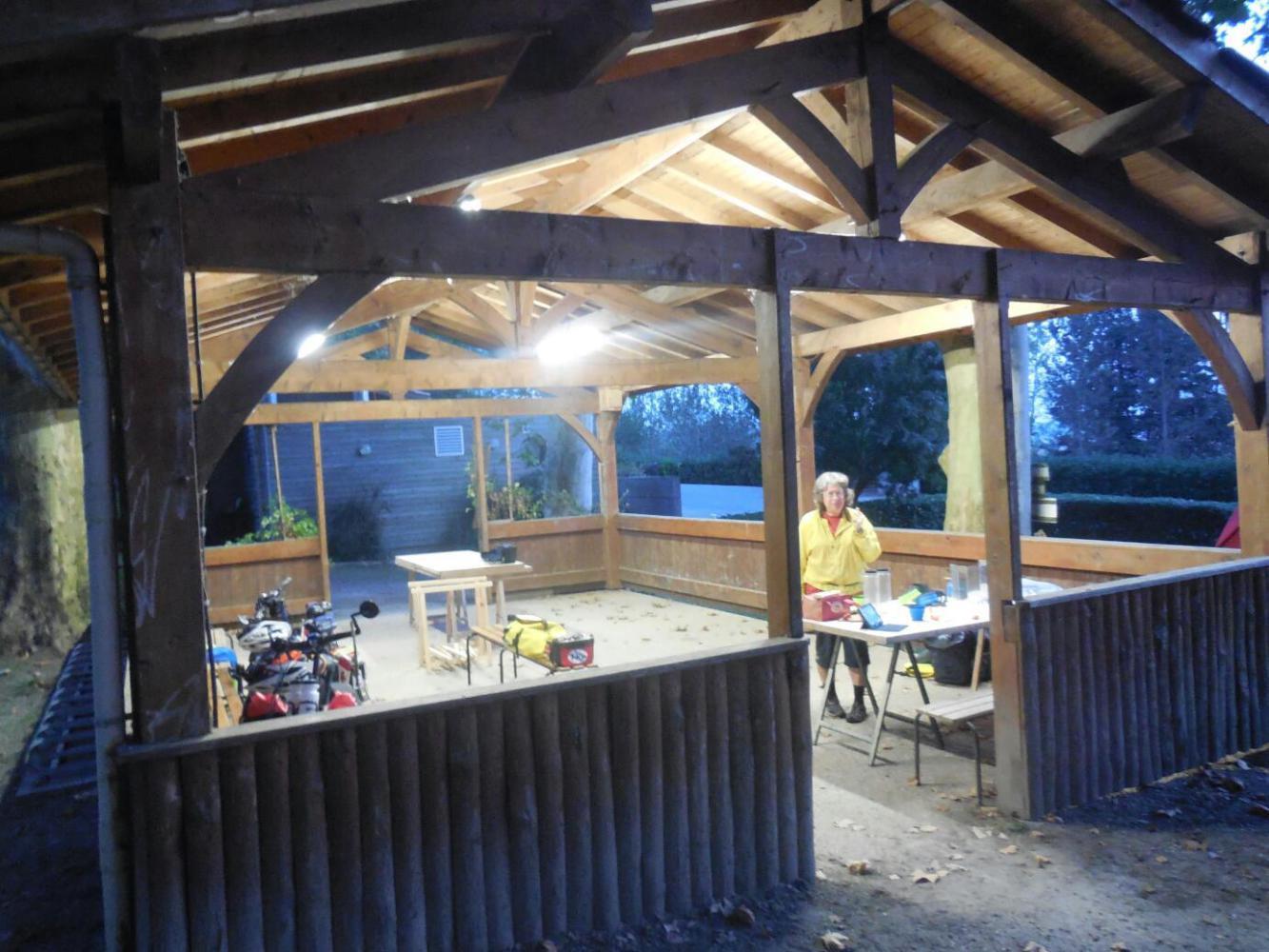 Whereas last night we did not want to call too much attention to ourselves, this morning we turned on the overhead lights in our shelter. So we had light, power, water, tables, and a roof. Wow!