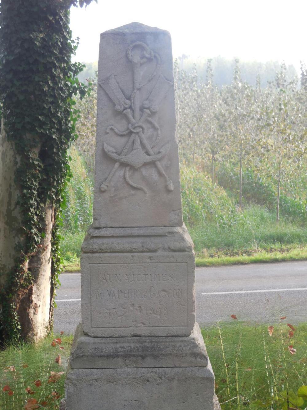 We researched this little monument a bit, found a second hand account from the blog of a French cyclist. He says the crew of the steam boat Gascon was hanging out in the cafe and forgot to have enough water in the engine, which then exploded.