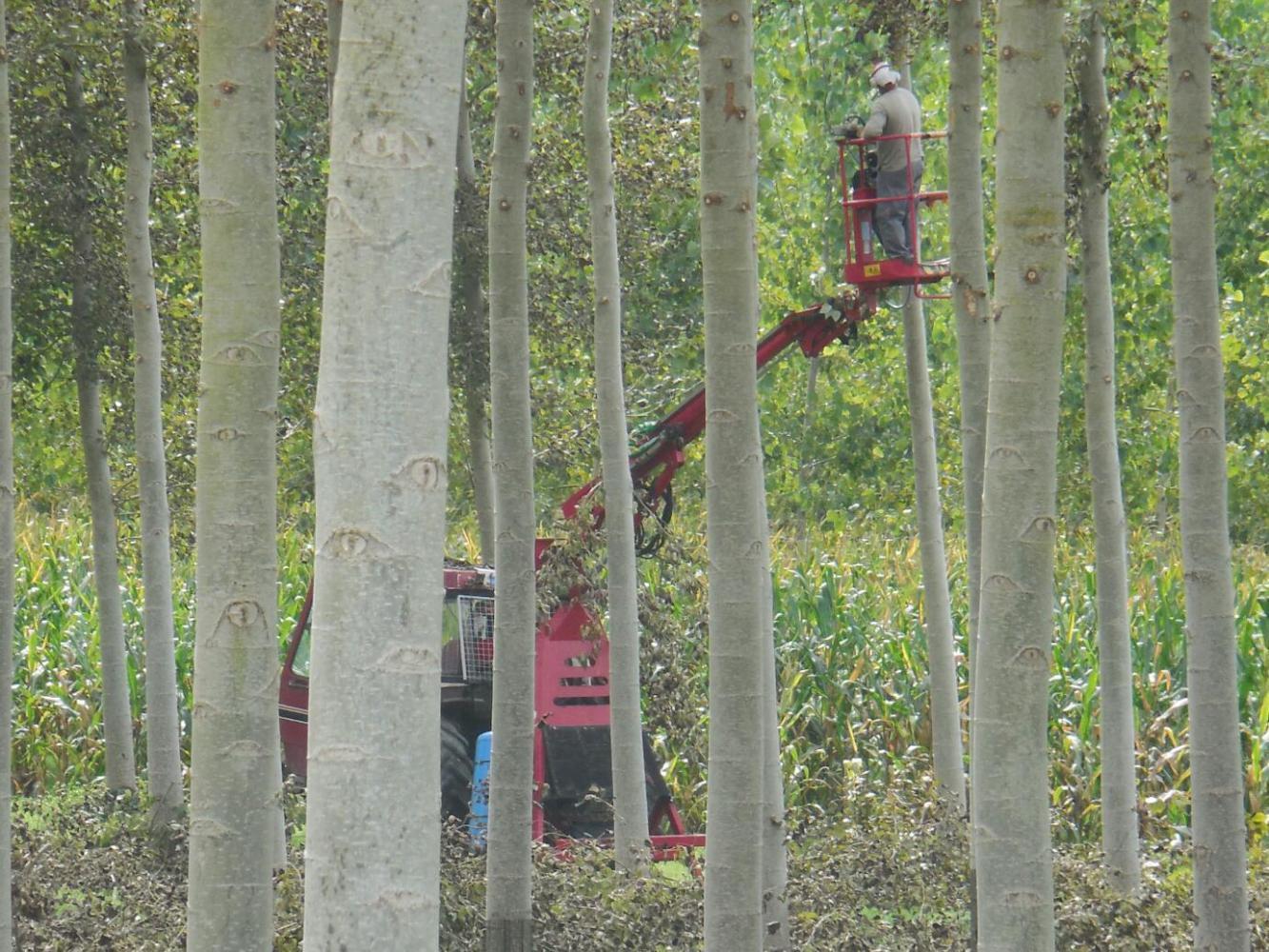 Tree pruning, to make them tall and straight for some reason. At first I thought the tractor had a circular collar saw, but the photo reveals a man in a bucket.
