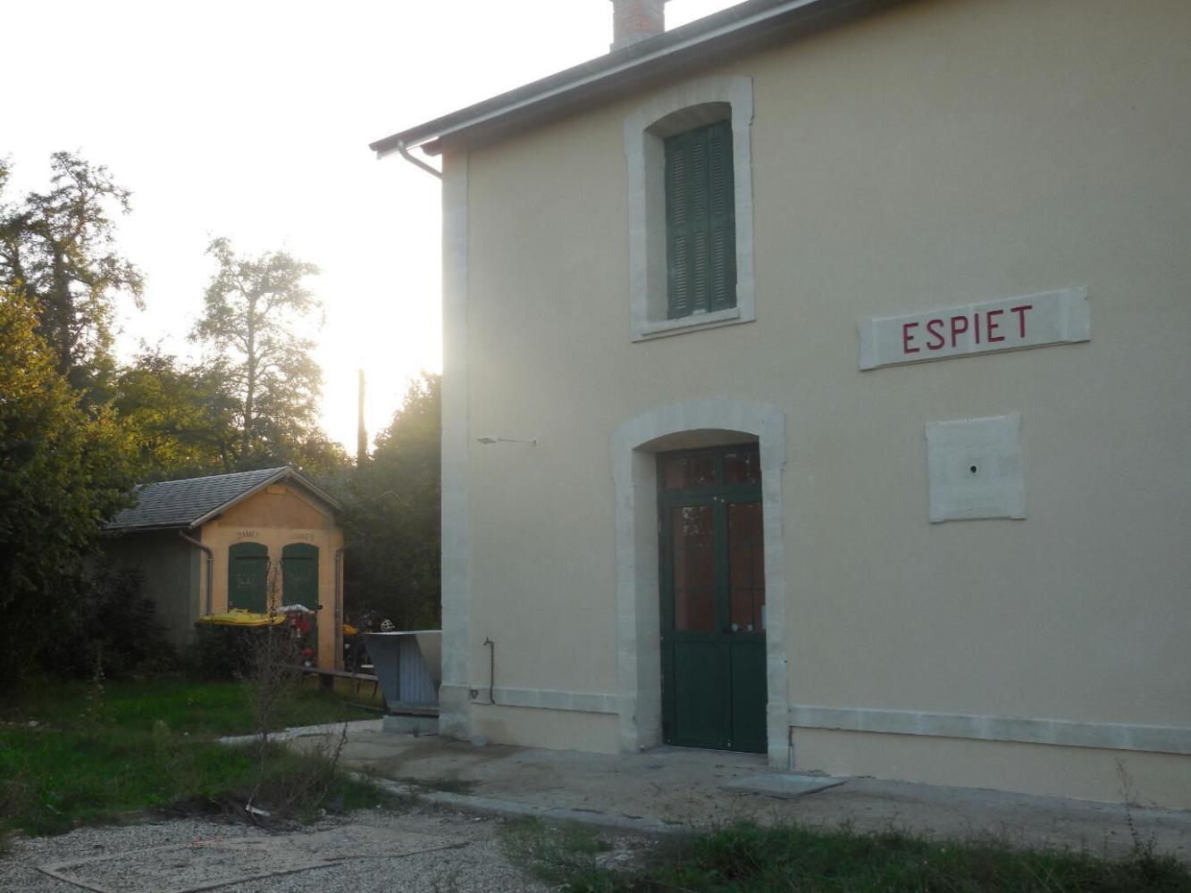 The bike path begins at the bottom of town, just out one of the gates. We realized after a bit thaf it was a rail trail, as we came to an unused station. On the flat smooth trail we made good time, but not good enough fo reach the only camping along the way. So, we started to look for a wild camp, and found it in the form of the former station at Espiet. The building is clearly under redevelopment as a restaurant, but is only partly done and seemingly on hold. The old washroom shack had an unlocked door with not only an apparently working toilet but a light that came on automatically. We also found a live water spigot outside the main building, plus some miscellaneous chairs and a small table.