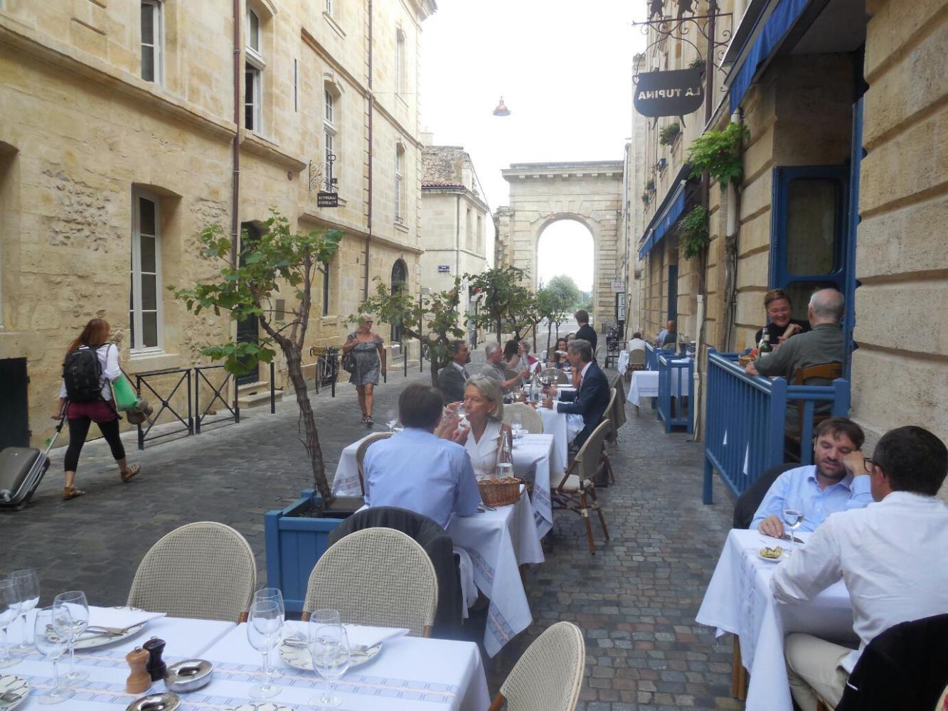 We proceeded along the quay, waiting to draw abreast of the largest church before diving into the city. But Dodie spied an old gate, and she loves old gates. So in we went. It turned out to be thhe Porte de la Monnaie. We only got 200 feet before encountering an outdoor restaurant, La Turpina. We had already planned to eat at a restaurant, and said what the hell, why not this one?