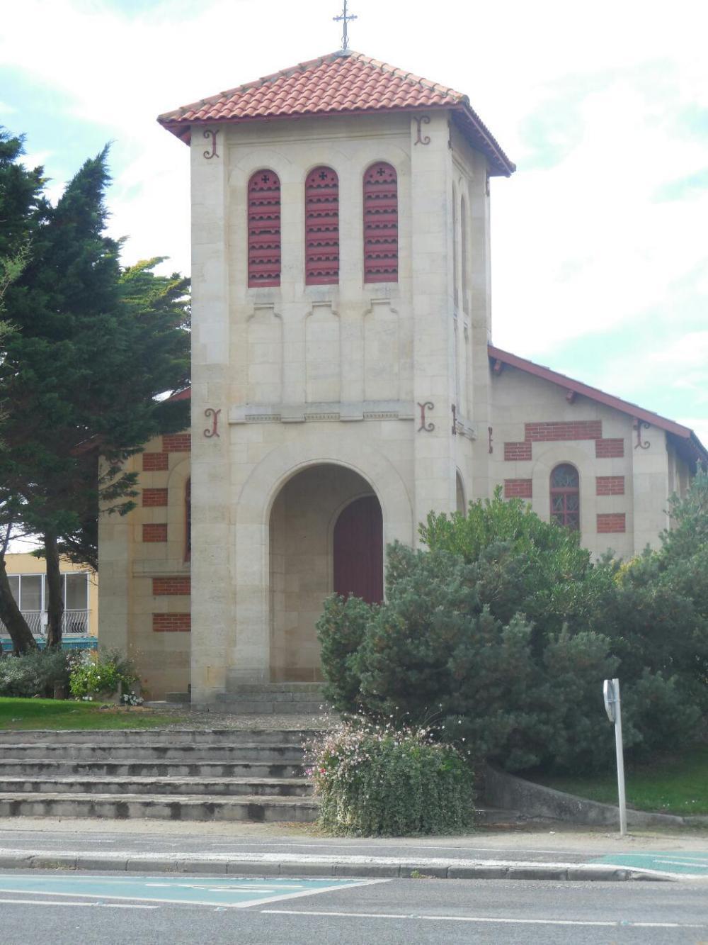 The Velodysee cycle path runs up the west side, and is well marked. We cruised through the pine forest and on toward Soulac and the ferry terminal at the tip of the peninsula. We passed by the hamlet of l'Amelie, clearly named for our granddaughter. In l'Amelie the church had a unique use of white trim and red brick. I assumed this was truly unique, but soon saw two houses with a similar design. So I assumed a local developer had cooked this up. When we hit Soulac, we found dozens and dozens of similar buildings, with this use of white trim and red brick. Hmmm, maybe this is an all Medoc style?