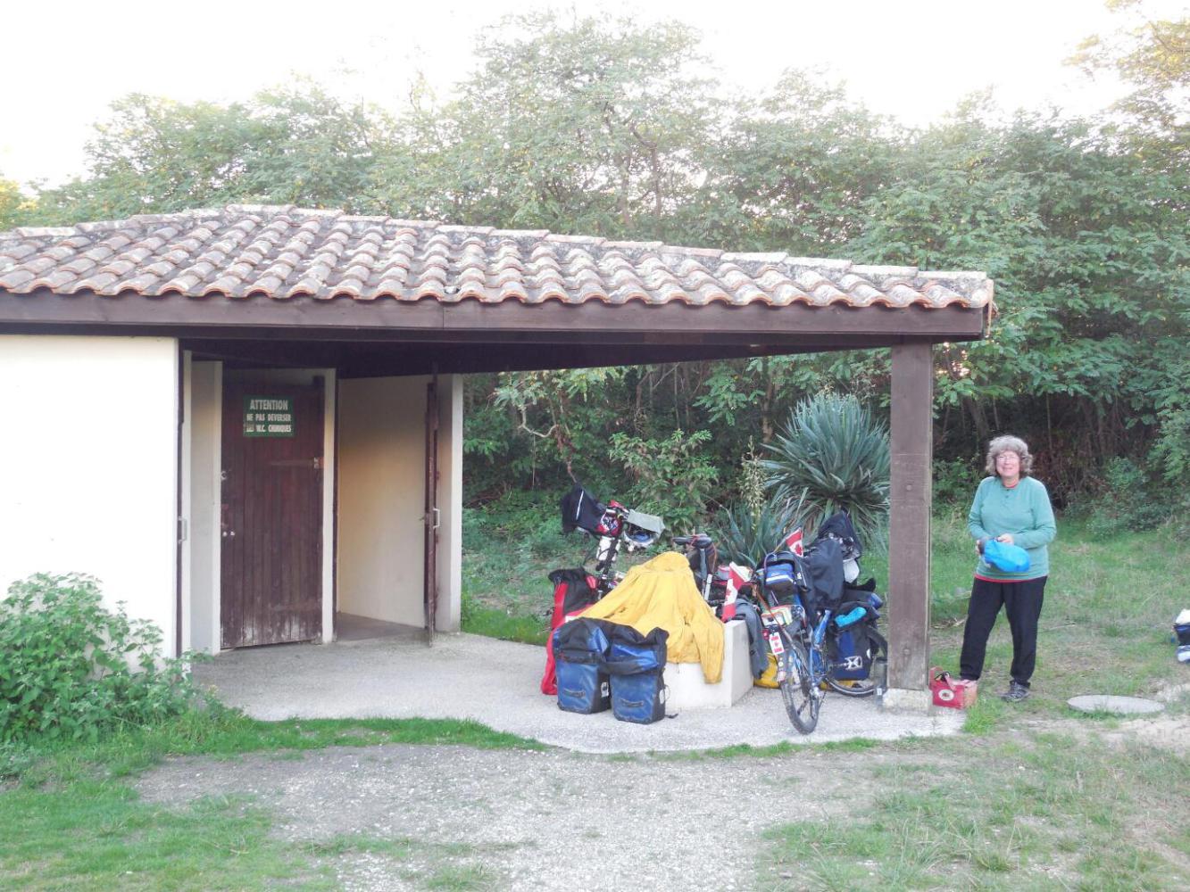 We decided not to hop on the last ferry, because it would have landed us on the other side toward dark. So we scoped out a nice wild camp by a WC near the terminal, and dropped into a restaurant with outdoor seating, nearby. The waitress first harassed us about where we had parked our bikes, then when asked for the menu, revealed that the place was closed, except for drinks. So, we said, why are there sandwich boards all over the sidewalk describing the specials of the day. Don't know, was the reply, I'm all alone here and can't control everything. Grrr. We cooked TV dinners by our WC.