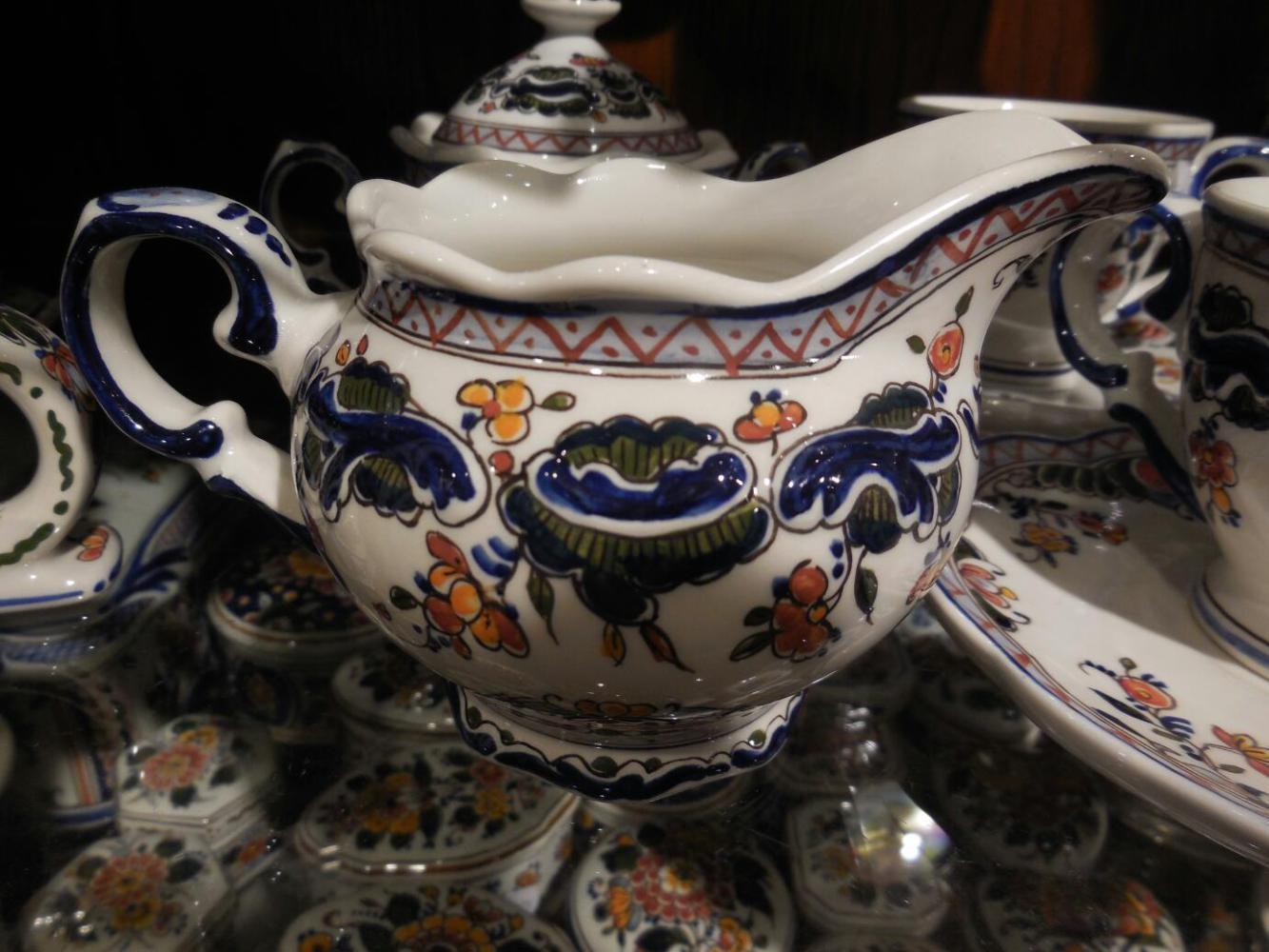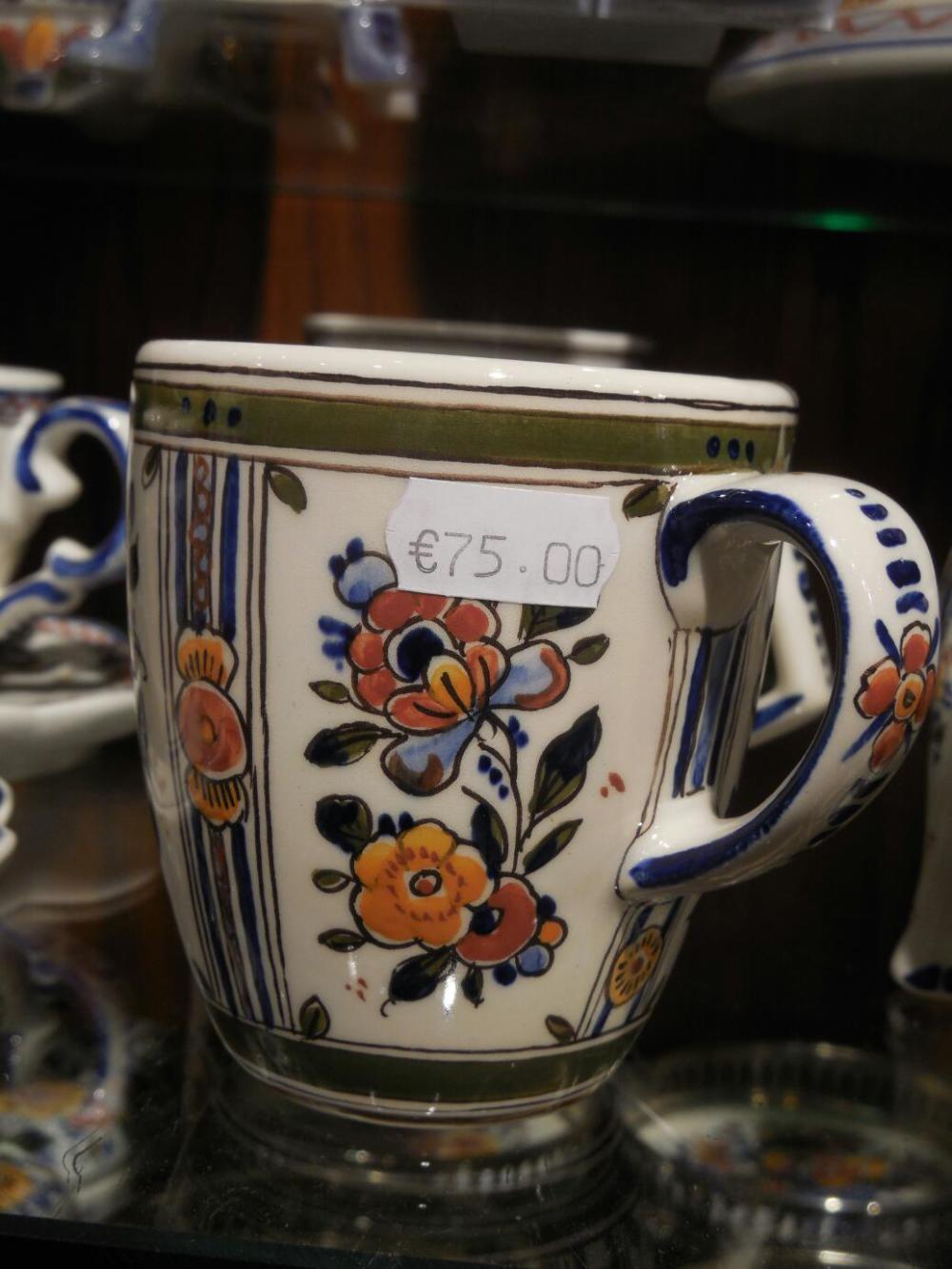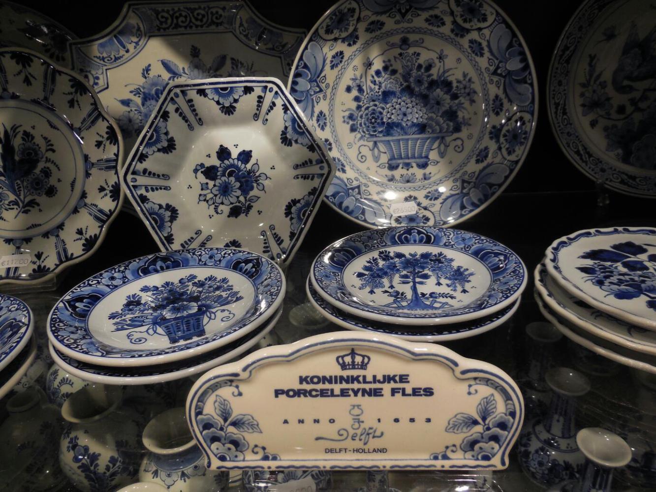Fortified by hot food and sheltered by umbrellas, we continued walking through town. Still no museums, though. Grampies are real country bumpkins. One quasi museum was the Delft porcelain shop. Delftware originated around the 16th century, no doubt influenced by Chinese pottery. At its peak, there were 30 companies producing the usually blue and white, hand painted pieces. Now, only six remain, of which Royal Delft is the best known. The shop had representation from all six, though, plus antique pieces. For the likes of Grampies, there was also some cheap stuff, much of it made by the six real companies, though. Prices for the really real stuff were like €75 for a mug and up to €20,000 for an elaborate multilevel tulip holder.