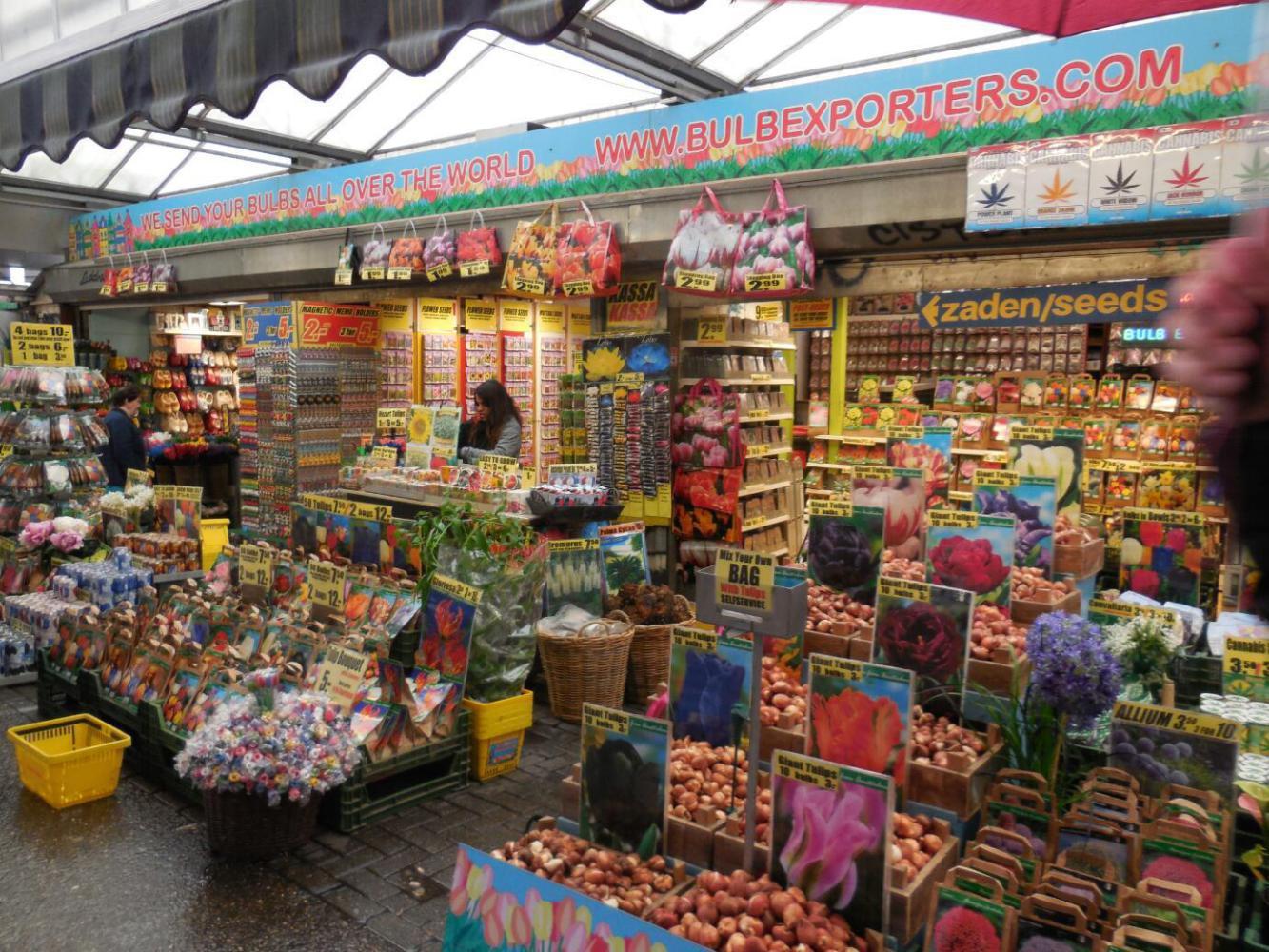 Under out new shelters we sailed down Damrak, headed for the flower bulb market. We came across an Indian restaurant, the Kohinoor, named for the famous diamond and no doubt reflecting Amsterdam's reputation as a diamond city. We are not exactly Indian food experts, but we come from an area of heavy Punjabi immigration and have certainly tried our share. So when we rated Kohinoor among the best ever, that was pretty significant. It was surprising for a place on the main drag in so touristic a city. Our waiter was also an amusing but good surprise. He spotted that Dodie suddenly lacked her paper place mat (scammed as a souvenir) and brought a replacement. He asked Dodie if she wanted ice for her coke, and when she (Canadian like) said no, not wanting to make him run around, he unceremoniously gave the cubes (that, unseen, were already in the glass) the boot, onto the table cloth. Then he had Dodie feel the bottle, to make absolutely sure that the coke was at the right temperature.