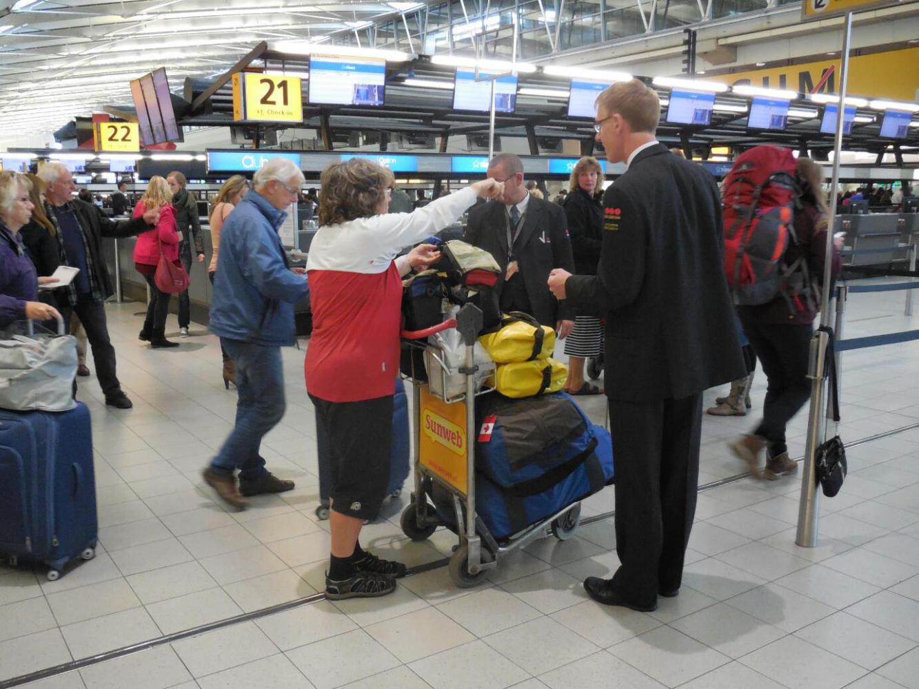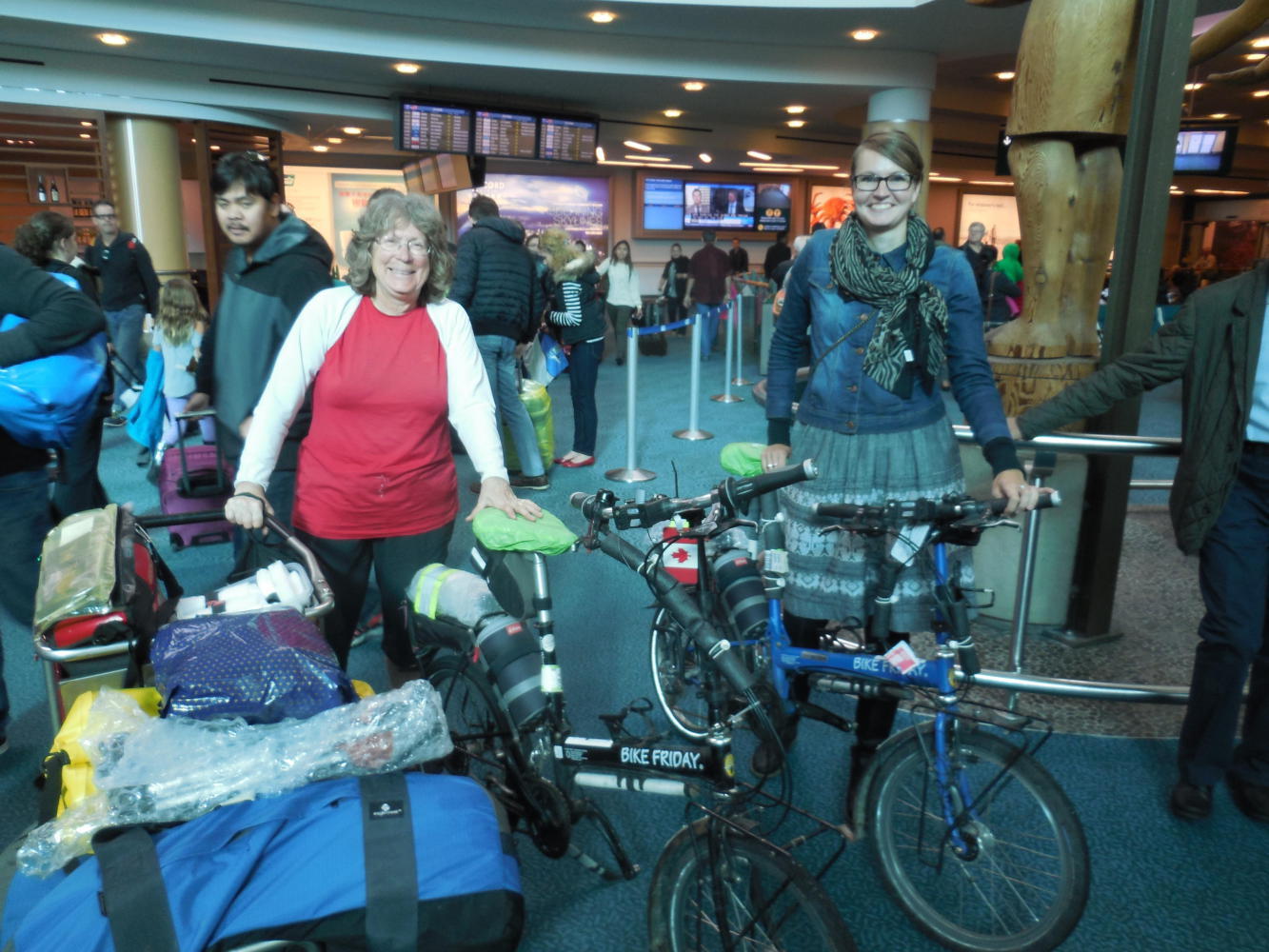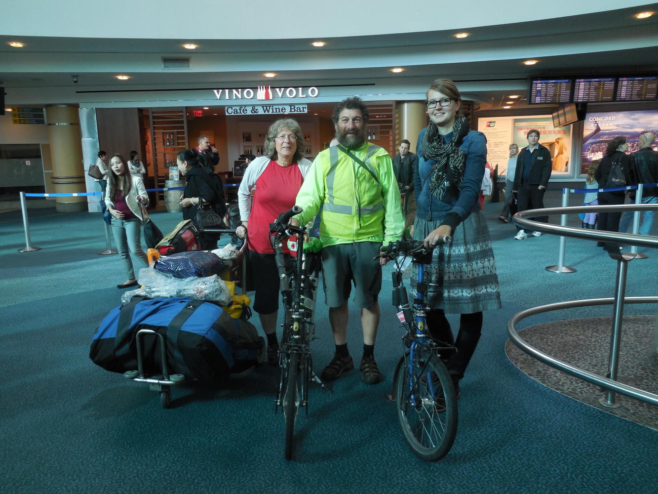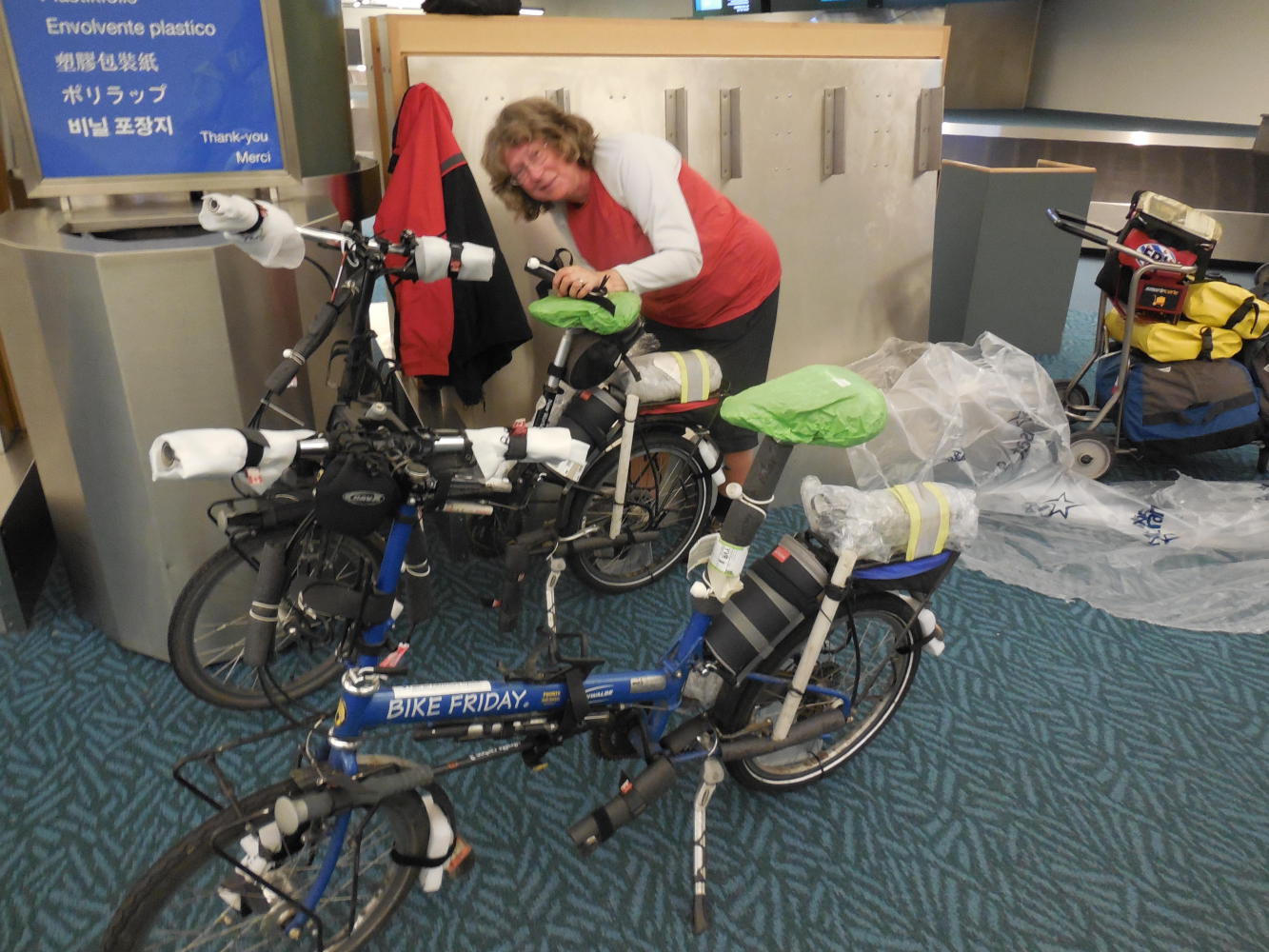 For once, we did not get lost. Our dry run on Thursday paid off, and we glided through the terminal doors, up the escalator, and to the quiet corner we had preselected for transforming ourselves from crazy guys on bikes to air passengers with a compact stack of luggage in the right weight and configuration.
