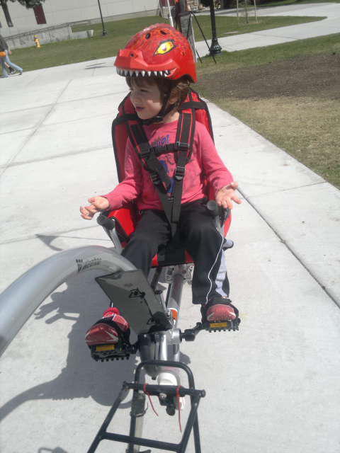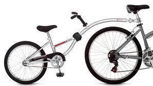 Next up is the Trail A Bike. With this, the child sits upright on a regular bike seat and pedals a custom one wheeled unit connected to your back seat. This version requires the child's attention to sit for the length of the ride.