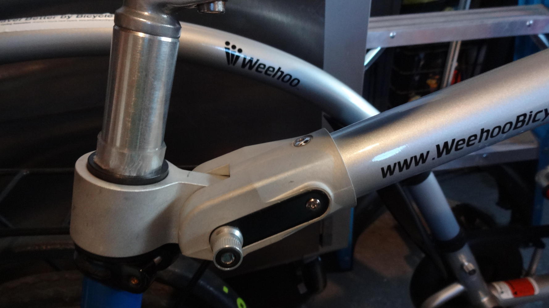 Our chief concern had been the point where the Wee Hoo grabs on to the lead bike's seat post. The connection needs to be tight, or the Wee Hoo will wobble, yet there needs to be enough play for the seat post to slide through the connector. Wee Hoo provides five assorted bushings to handle the most common sizes of seat posts. Unfortunately, there are 20-30 seat post diameters in existence. Naturally, our Bike Friday posts were not among the exalted five.
