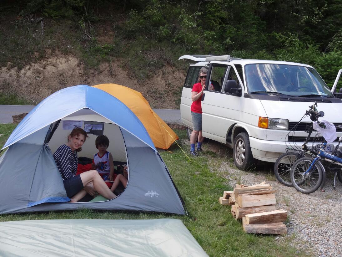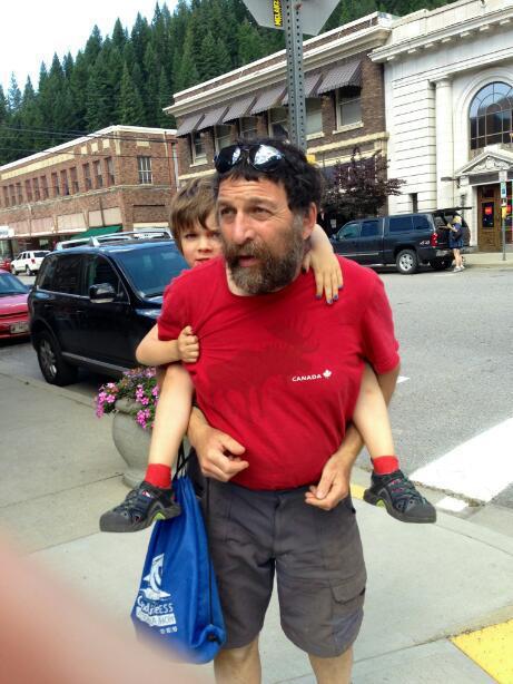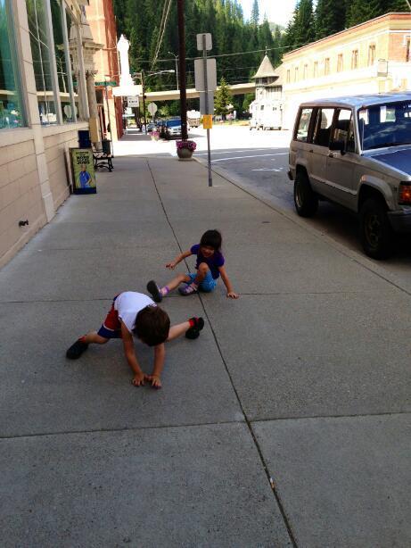 When Laurie joined us, there was a great mother and child reunion, followed by a trek into Wallace to find (of course) the bakery, plus some hot dogs. The kids chose this as a good time to throw some tantrums, demand to be carried, and squabble over who would be carried by which adult. We did eventually drag them back to camp and into a tent for some quiet recovery. Before long, a campfire with hot dogs and marshmallows should complete their rehabilitationţ
